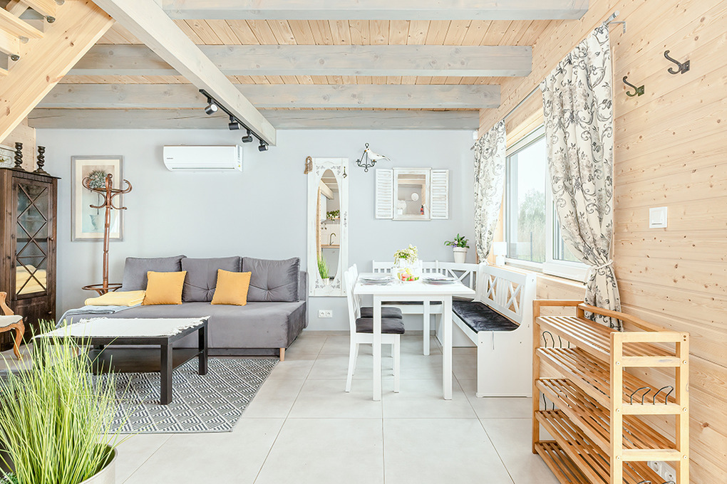 PL 45.5 Ferienhaus 2-6 Pers.: Mit viel Liebe zum Detail eingerichtetes 3-Zimmerhaus mit 60 qm Wohnfläche über zwei Etagen. Parterre: Geräumiger, lichtdurchfluteter Wohn/-Essraum mit Couch (Ausziehcouch 2 Pers), Sat-TV mit dt. Programmen, Internet (WLan über LTE), Esstisch, Küchenzeile (2 Pl. Induktion, Mikrowelle, Spülmaschine). Bad/WC. Vom Wohnraum Holztreppe ins Dachgeschoss mit Schrägen: Doppelzimmer, 2-Bettzimmer mit Eizelbetten. Überdachte Terrasse mit Sitzmöbeln, Poolblick. Die Anlage ist Video-überwacht.