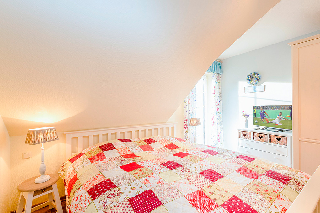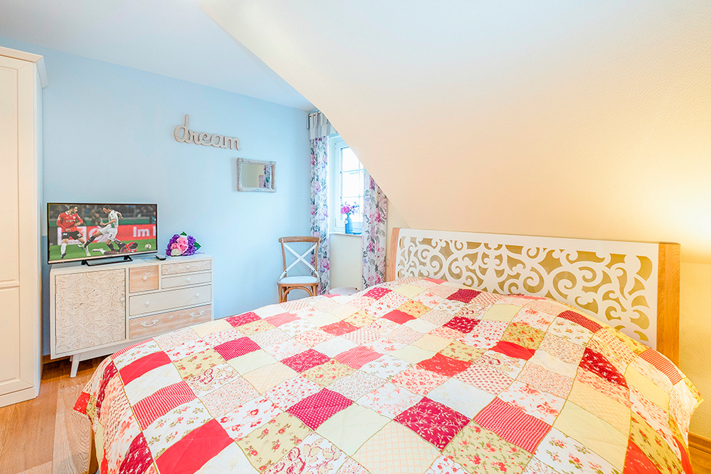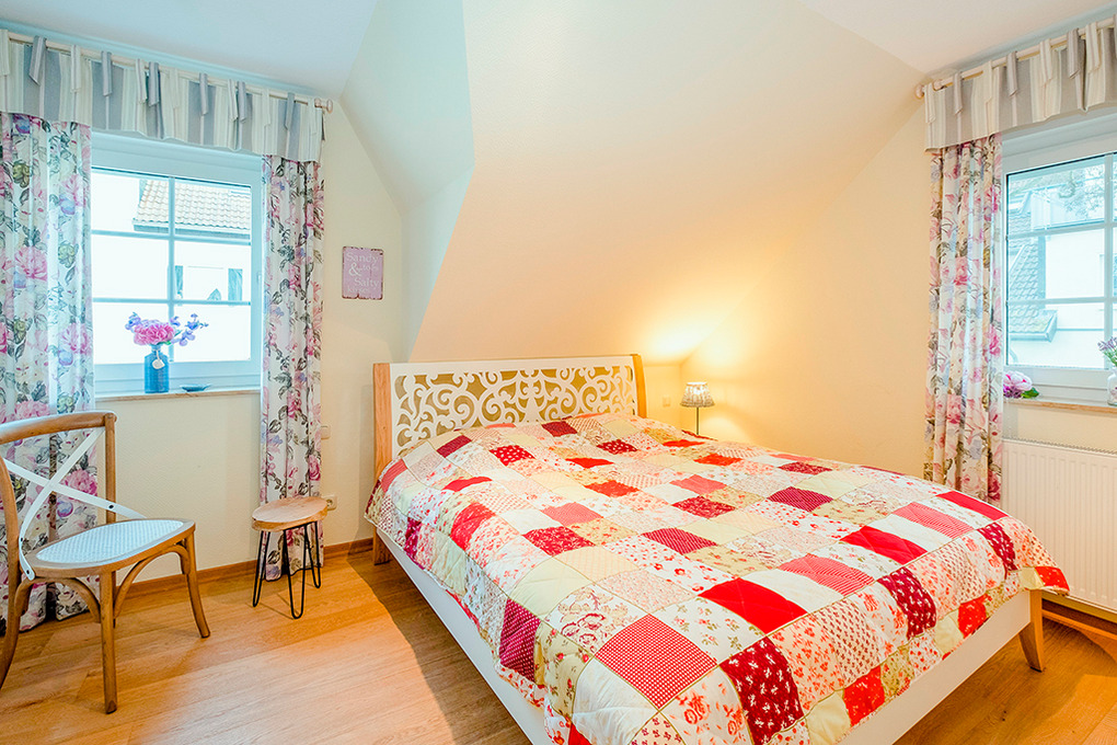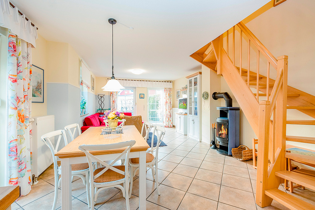 D 67.5101 Ferienhaus 1-6 Pers.: Großzügige 4-Zimmerhaushälfte mit 85 qm Wohnfläche über 3 Etagen. Nichtraucherhaus. Parterre: Heller, freundlicher Wohn-/Essraum mit gemütlicher Couchgarnitur, Kaminofen, Flachbild-Sat-TV, Esstisch, moderne Küchenzeile (Backofen, Mikrowelle, Spülmaschine). Bad/WC. 1. Etage: 2 Doppelzimmer mit Flachbild-Sat-TV. Bad: Du, Wb, WC, Sauna, Waschmaschine, Trockner. Treppe in den Spitzboden: 2-Bettzimmer.
