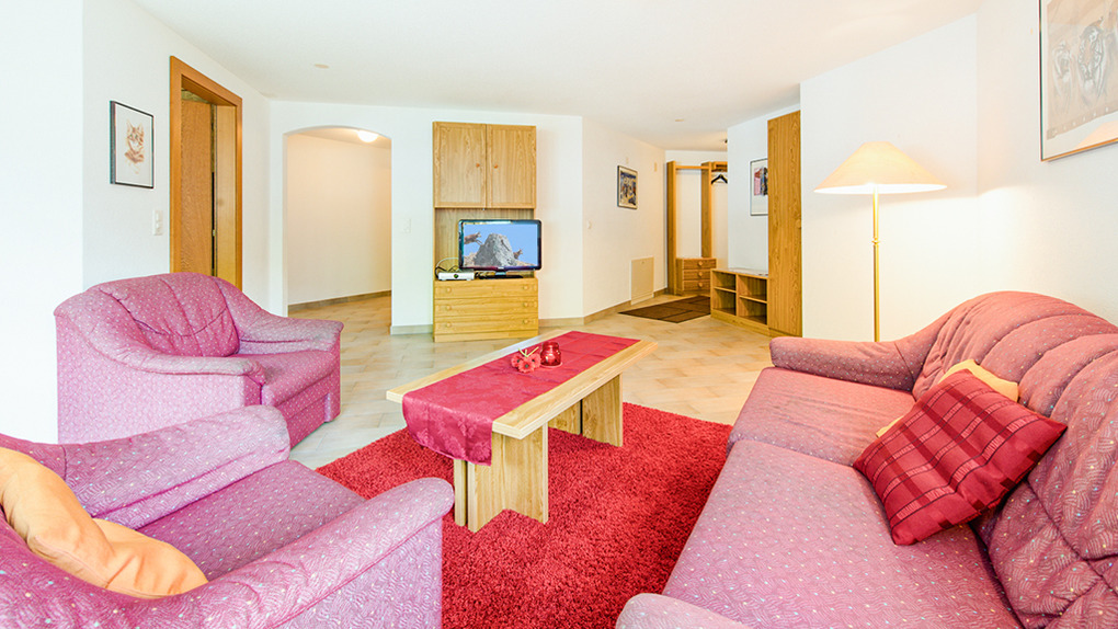 CH 291.34A Wohnung 1-6 Pers.: 4 1/2-Zimmerwohnung mit 120 qm Wohnfläche, 1. Etage. Schöner Wohnraum mit gemütlicher Sofa-Sitzgruppe, Flachbild-TV, Radio/CD, Esstisch, Balkon. Küchen-/Essraum mit Esstisch, Küchenzeile (Backofen, Spülmaschine). Drei Doppelzimmer, davon zwei mit Balkon. Zwei Bäder: Bw bzw. Du, Wb, WC.