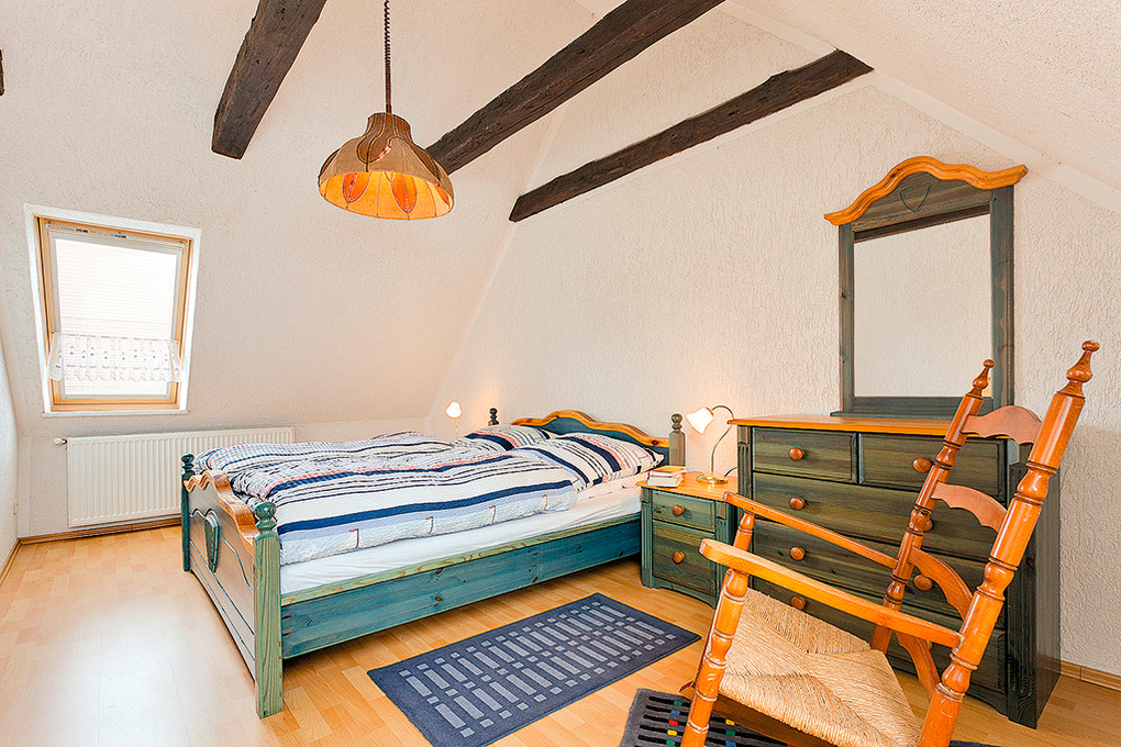 D 136.90 Ferienhaus 2-6 Pers.: 2 ½-Zimmer-Reihenhaus mit ca. 90 qm Wohnfläche über 2 Etagen. Parterre: Diele mit Garderobe. Großer Wohn-/Essraum mit Kachelofen, Sofalandschaft (Schlafcouch 1 Pers.), Sat-TV, Radio/CD, Esstisch, Küchenzeile (Backofen, Mikrowelle, Spülmaschine). Bad: Du, Wb, WC, Waschmaschine. 1. Etage (leichte Schrägen): Doppelzimmer mit kl. Ankleidezimmer. Kleines 4-Bettzimmer mit zwei Einzelbetten, zwei Ausziehbetten. Separates WC. Hinweis: der Vermieter erlaubt eine max. Belegung mit 6 Personen.