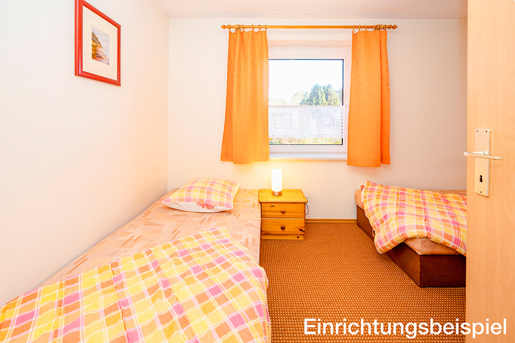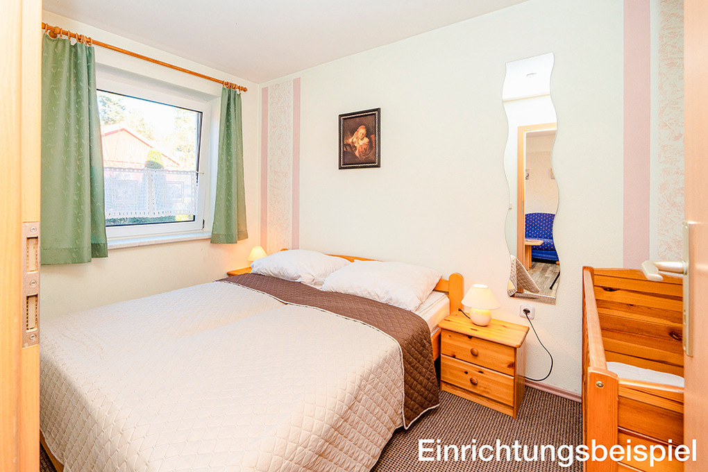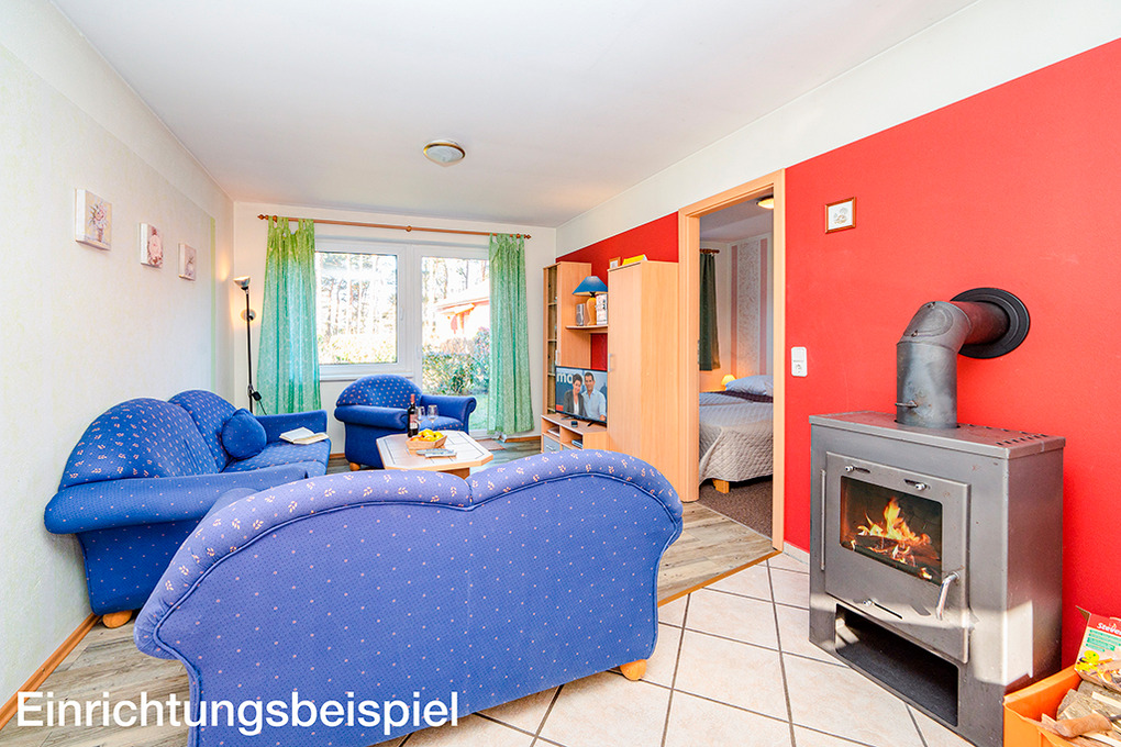 D 45.23 Ferienhäuser 2-6 Pers.: Schöne 3-Zimmerhäuser mit ca. 44 qm Wohnfläche, Parterre. Wohn-/Essraum mit Kaminofen, Couchgarnitur (Ausziehcouch 2 Pers.), Sat-TV, Radio/CD, Esstisch, Küchenzeile (Backofen). Doppelzimmer mit Kinderbett. 2 Bettzimmer. Bad/WC.