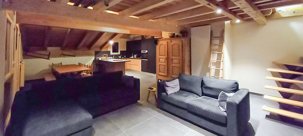 F 16.56 Wohnung 4-8 Pers.: 4-Zimmerwohnung mit 100 qm Wohnfläche, 3. Etage. Schöner, bis zum Dach ausgebauter Wohnraum mit großer Panoramafensterfront, Sitzecke am Kamin, Smart-TV, Spiele-Konsole, Esstisch, moderner Einbauküche (Backofen, Mikrowelle, Spülmaschine), Balkon. Doppelzimmer mit Bad (Du, 2 Wb, WC). 3-Bettzimmer mit 2 Einzelbetten, Bad (Du, Wb), Einzelbett auf Galerie unterm Dach (Schrägen), Balkon. Vom Wohnraum aus Treppe ins ausgebaute Dachgeschoss mit Schrägen: uriger Schlafraum mit 4 Einzelbetten. Bad: Bw/Du, Wb, WC. Waschmaschine in der Wohnung.