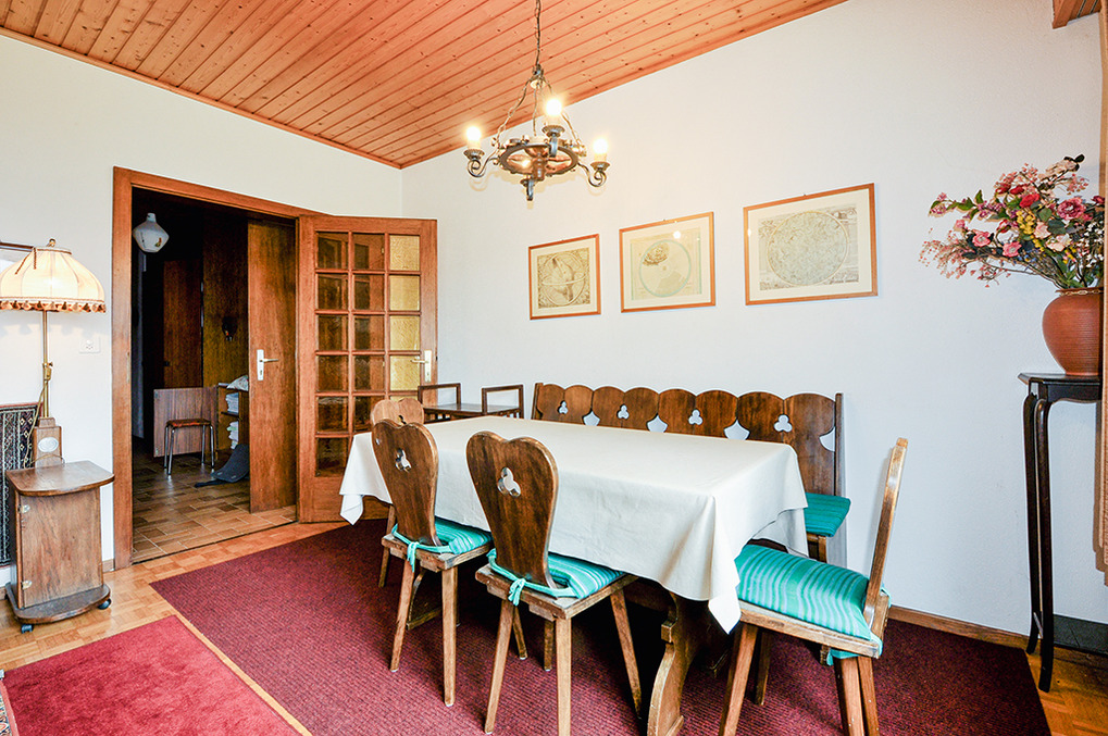 Haus: Großes regionaltypisches Chalet mit Schwimmbad und Sauna. . Schönes Wohnhaus mit 2 Ferienwohnungen und der fest bewohnten Wohnung des Vermieters. Gemütliche Chalet-Atmosphäre durch Holzvertäfelungen in vielen Räumen. Im Haus: großes Schwimmbad (10 x 4,50 Meter, 24°C, kostenfrei nutzbar) mit Ruheliegen vor großen Panoramafenstern, Sauna (Gebühr), Duschen, WC. Buchbar sind die untere Etage des Hauses (CH 361.018) und eine separate Wohnung im ersten Stock (CH 361.019). Das gesamte Haus für bis zu 14 Personen kann auch unter der Nummer CH 361.020 gebucht werden (separate Anzeige).