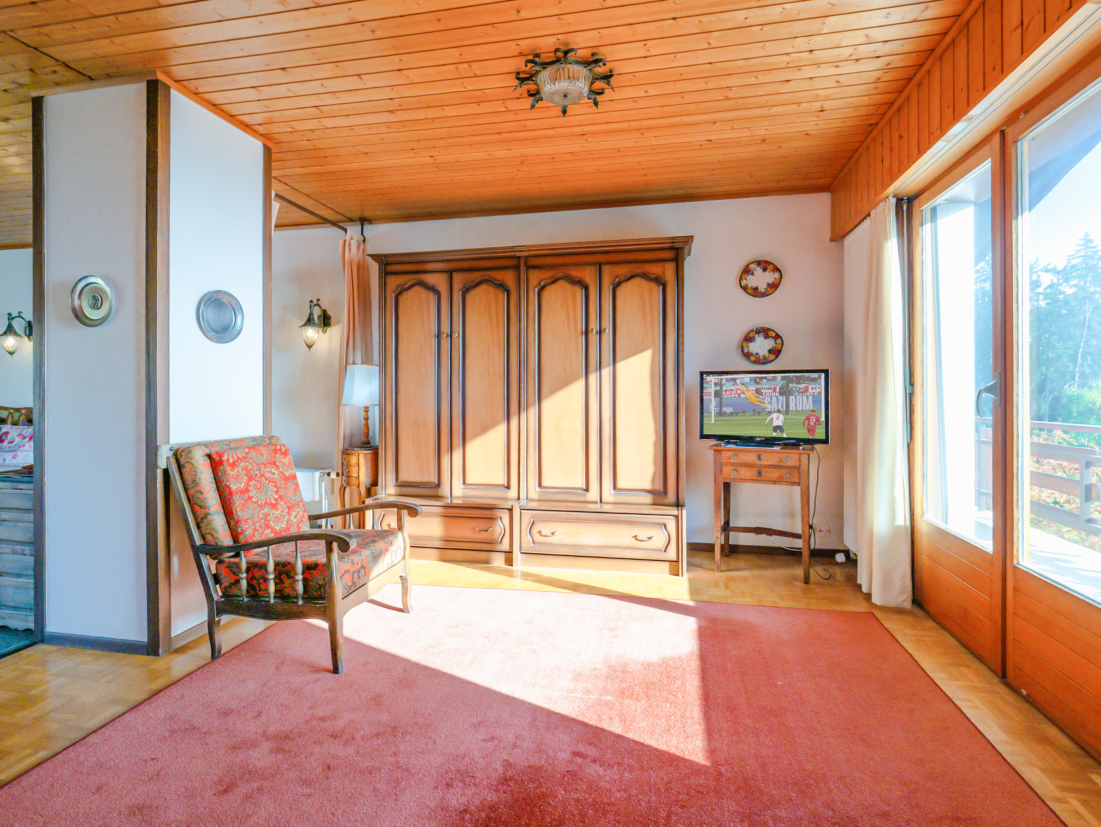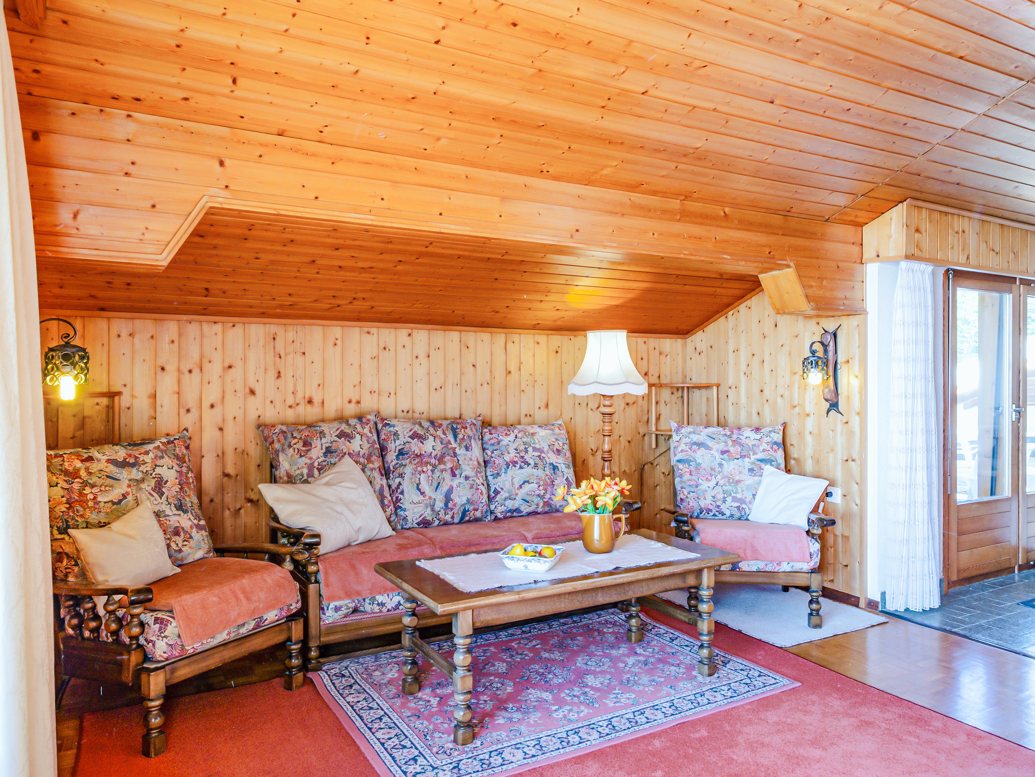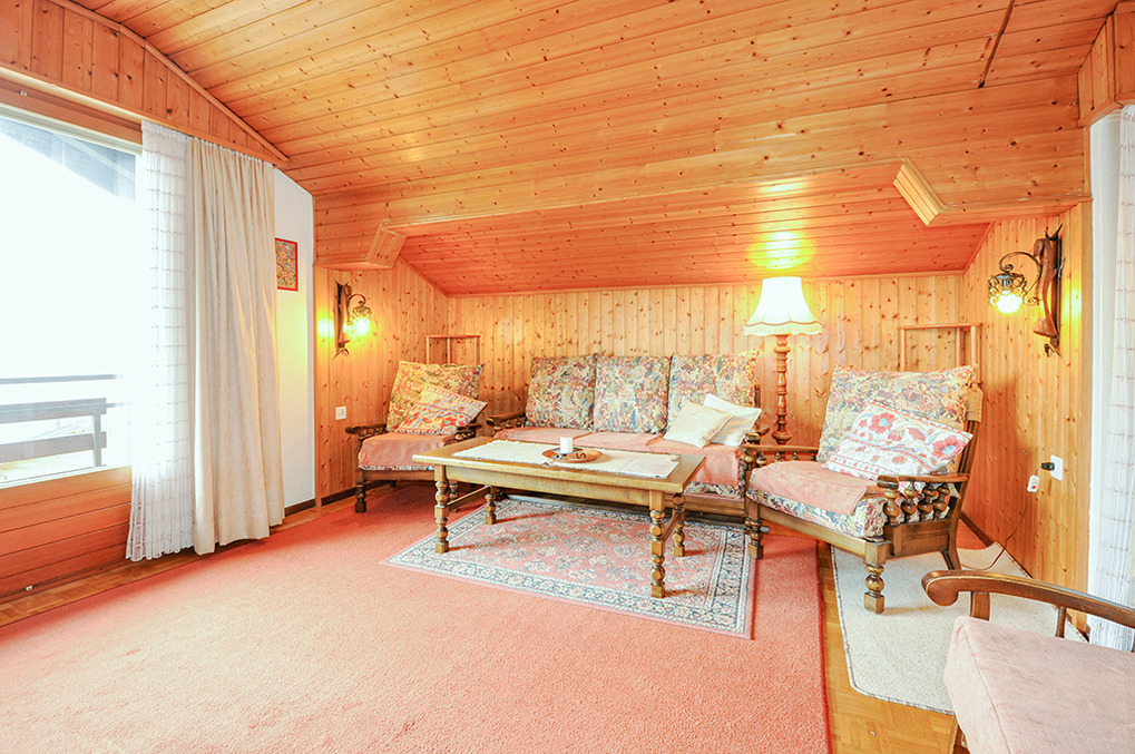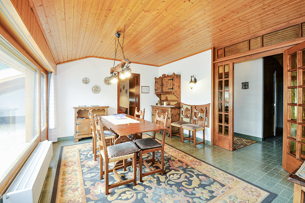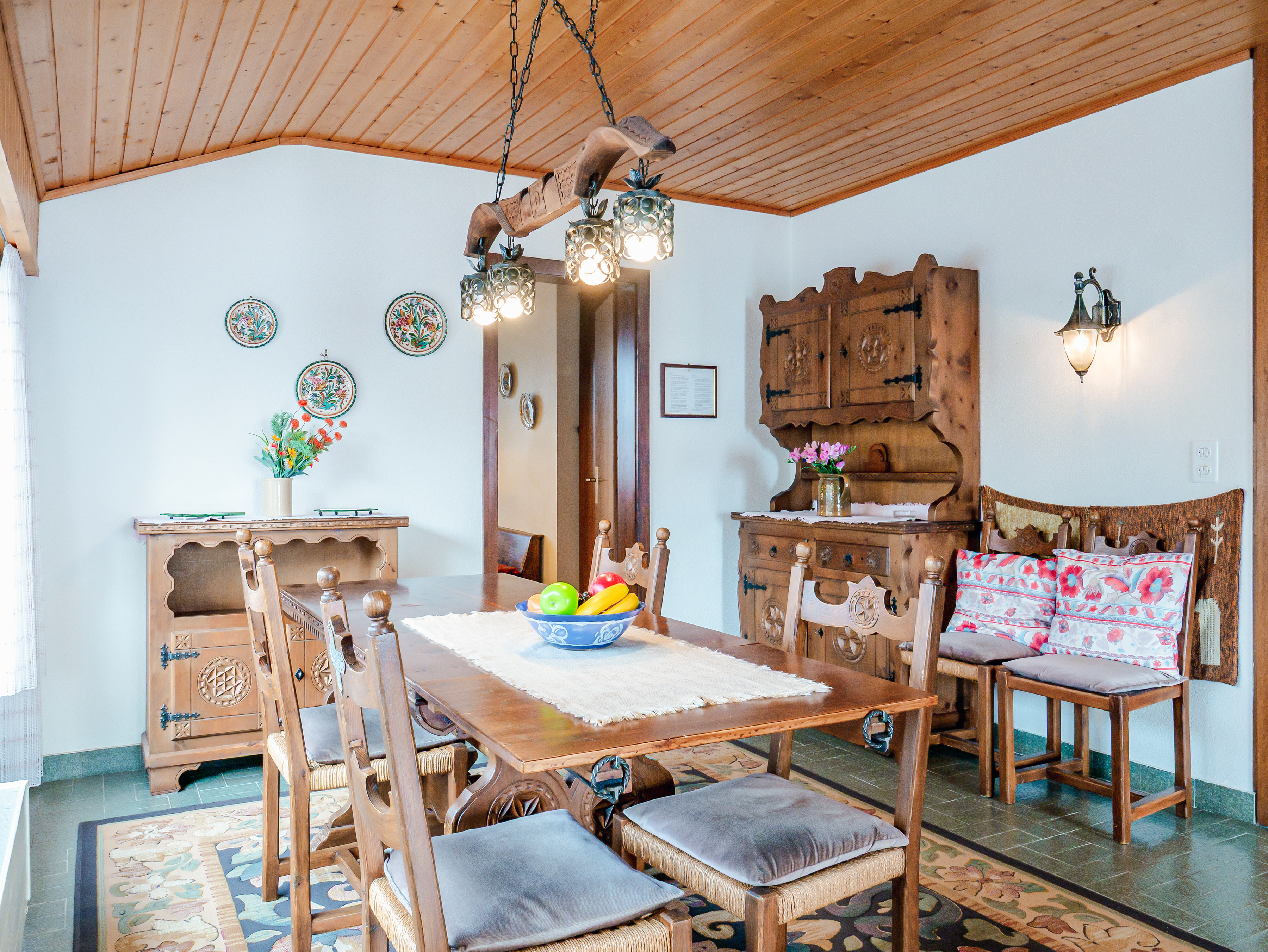 Haus: Großes regionaltypisches Chalet mit Schwimmbad und Sauna. Schönes Wohnhaus mit 2 Ferienwohnungen und der fest bewohnten Wohnung des Vermieters. Gemütliche Chalet-Atmosphäre durch Holzvertäfelungen in vielen Räumen. Im Haus: großes Schwimmbad (10 x 4,50 Meter, 24°C, kostenfrei nutzbar) mit Ruheliegen vor großen Panoramafenstern, Sauna (Gebühr), Duschen, WC. Buchbar sind die untere Etage des Hauses (CH 361.018) und eine separate Wohnung im ersten Stock (CH 361.019). Das gesamte Haus für bis zu 14 Personen kann auch unter der Nummer CH 361.020 gebucht werden (separate Anzeige).