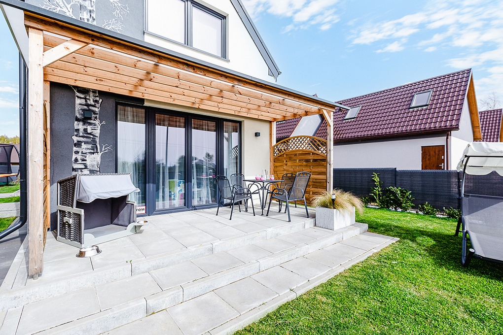 Haus: Gepflegte Ferienhaus-Anlage mit Rezeption. Schöne, moderne Ferienhäuser mit geschmackvoller Einrichtung, E-Kamin. Kostenloses Internet (WiFi). Fußbodenheizung. Terrasse mit Sitzmöbeln, Grill. Kinderspielplatz mit Klettergerüst, 2 Rutschen. 1 Pkw-Stellplatz/Haus.