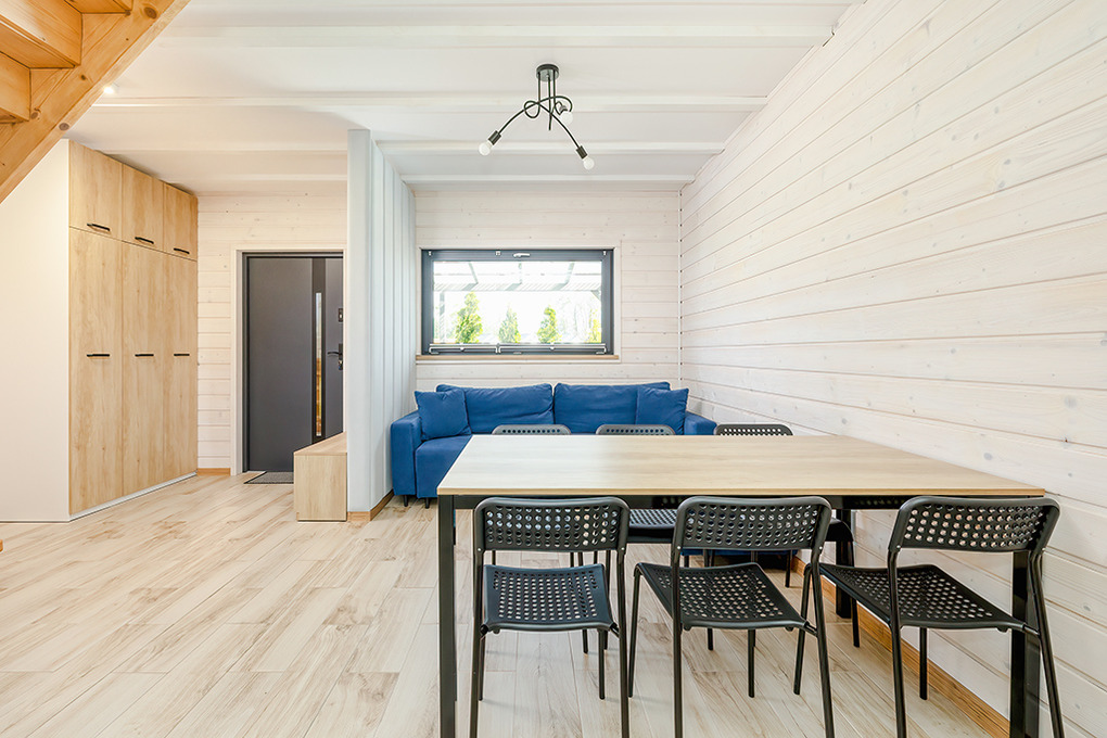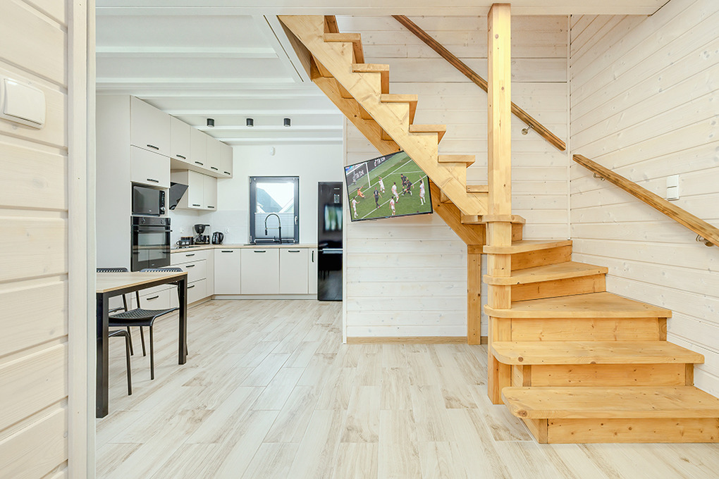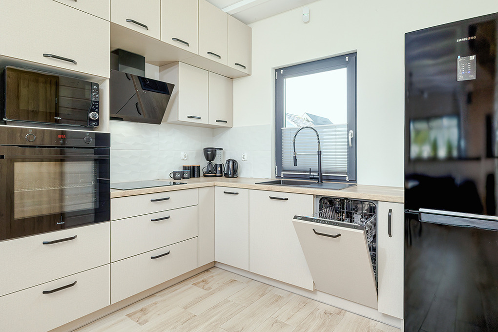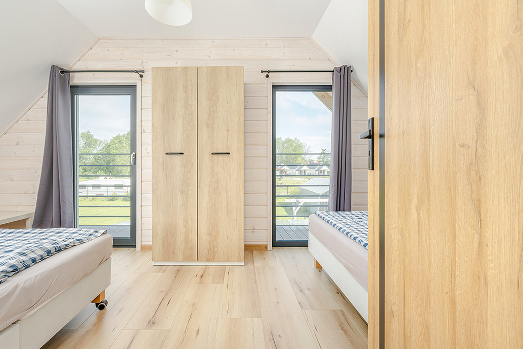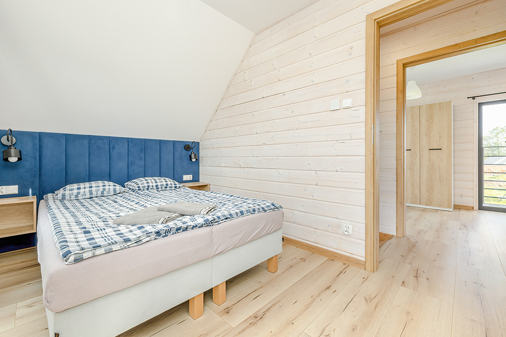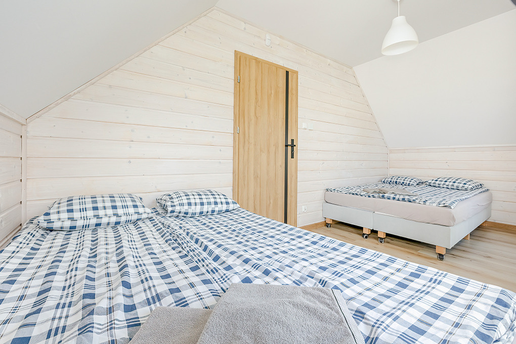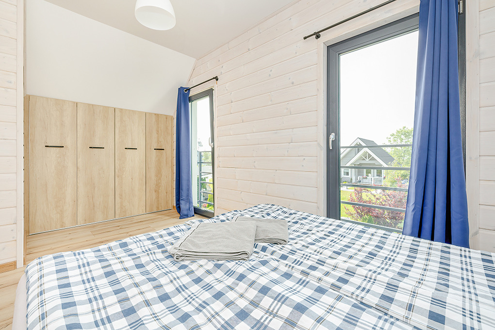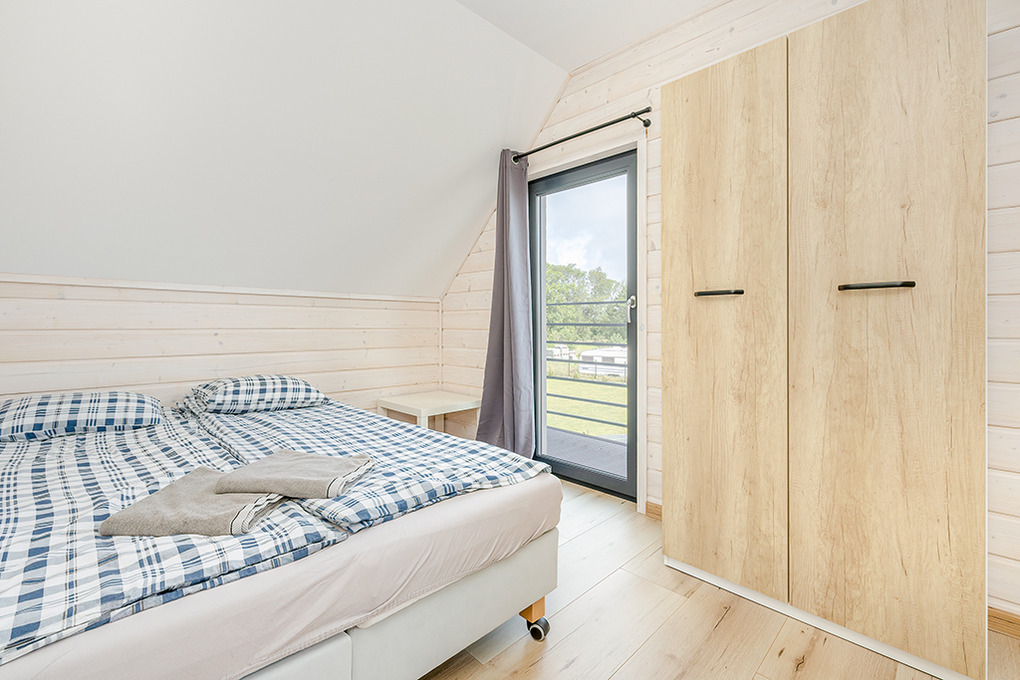 PL 55.28 Ferienhaus 1-8 Pers.: Komfortables 3-Zimmerhaus mit ca. 70 qm Wohnfläche über 2 Etagen. Parterre: Wohn-/Essraum mit Ecksofa (Ausziehcouch 2 Pers.), Smart-TV mit deutschen Programmen, großem Esstisch, moderner, sehr gut ausgestatteter Küchenzeile (4 E-Platten, Abzugshaube, Backofen, Mikrowelle, Tiefkühltruhe 90 l, Spülmaschine). Bad: Du, Wb, WC, Waschmaschine. 1. Etage: 4-Bettzimmer mit zwei franz. Doppelbetten, kleinem Balkon. Doppelzimmer. Separates WC. Terrasse mit Sitzmöbeln, Grill.