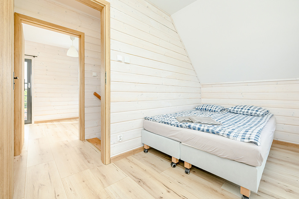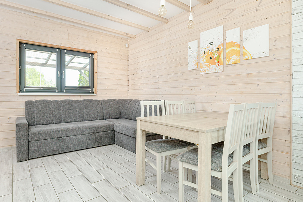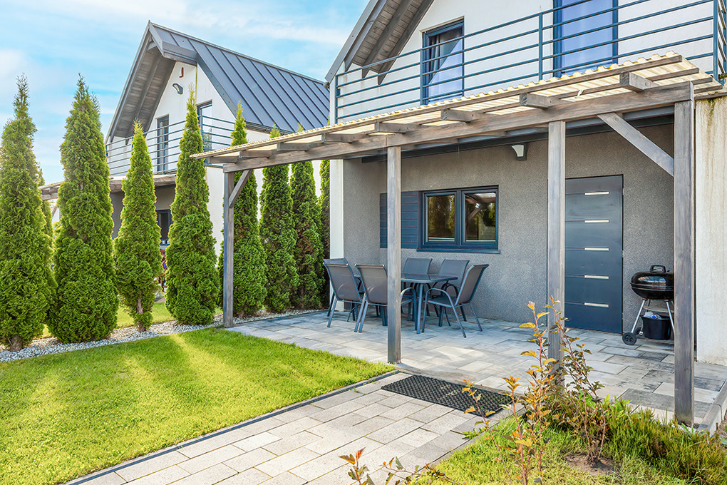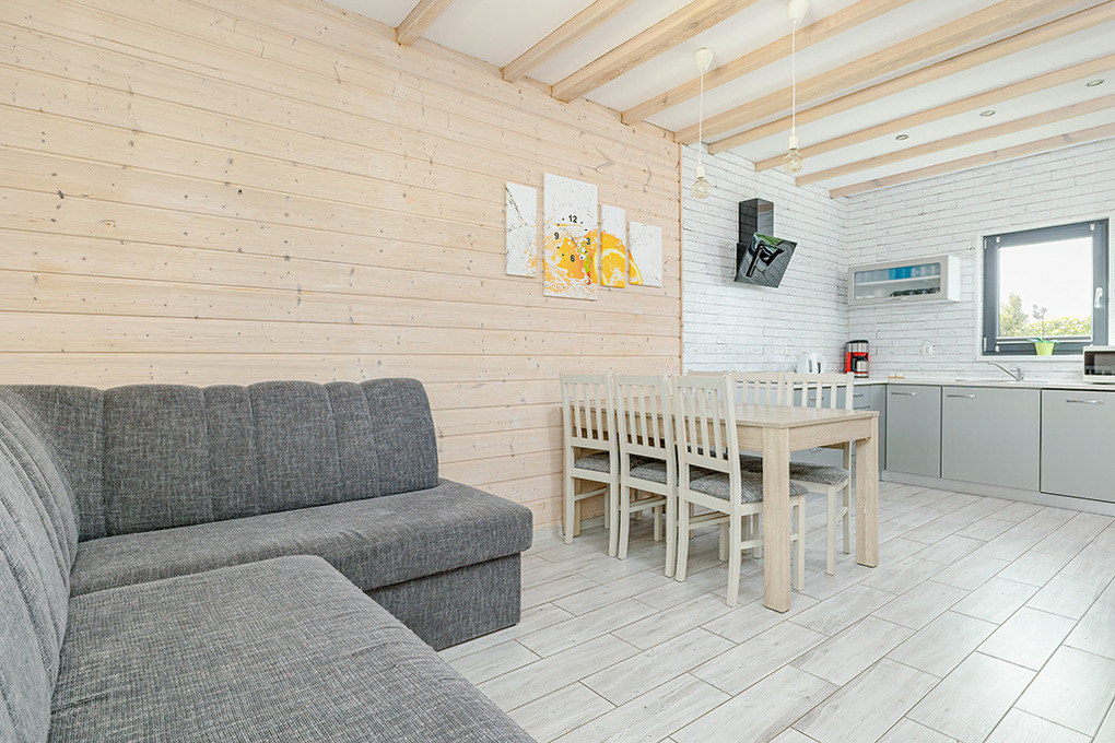 PL 55.29 Ferienhaus 1-8 Pers.: Komfortables 3-Zimmerhaus mit ca. 70 qm Wohnfläche über 2 Etagen. Parterre: Wohn-/Essraum mit Ecksofa (Ausziehcouch 2 Pers.), Smart-TV mit deutschen Programmen, großem Esstisch, moderner, gut ausgestatteter Küchenzeile (4 E-Platten, Abzugshaube, Mikrowelle, Tiefkühltruhe 30 l, Spülmaschine). Bad: Du, Wb, WC. 1. Etage: 4-Bettzimmer mit kleinem Balkon. Doppelzimmer. Separates WC. Terrasse mit Sitzmöbeln, Grill.