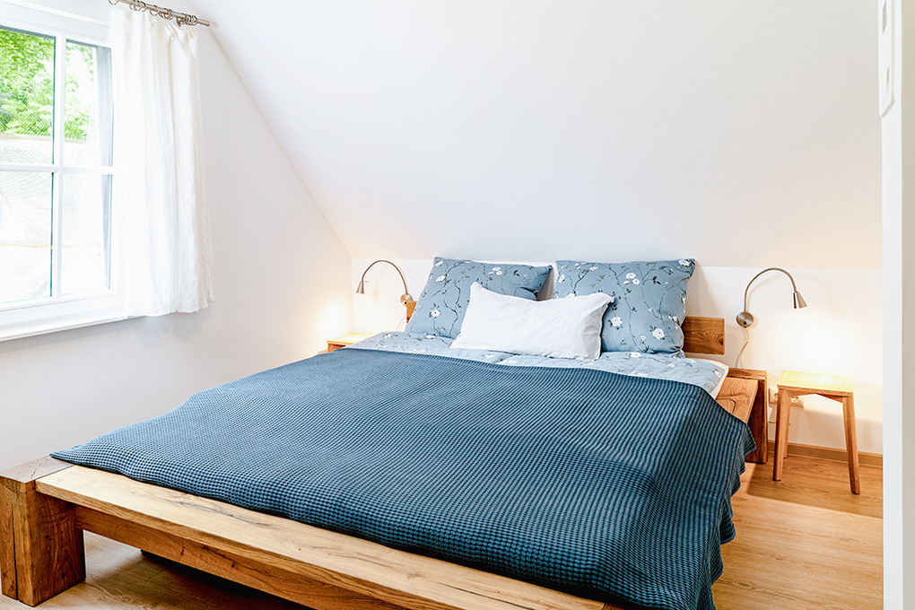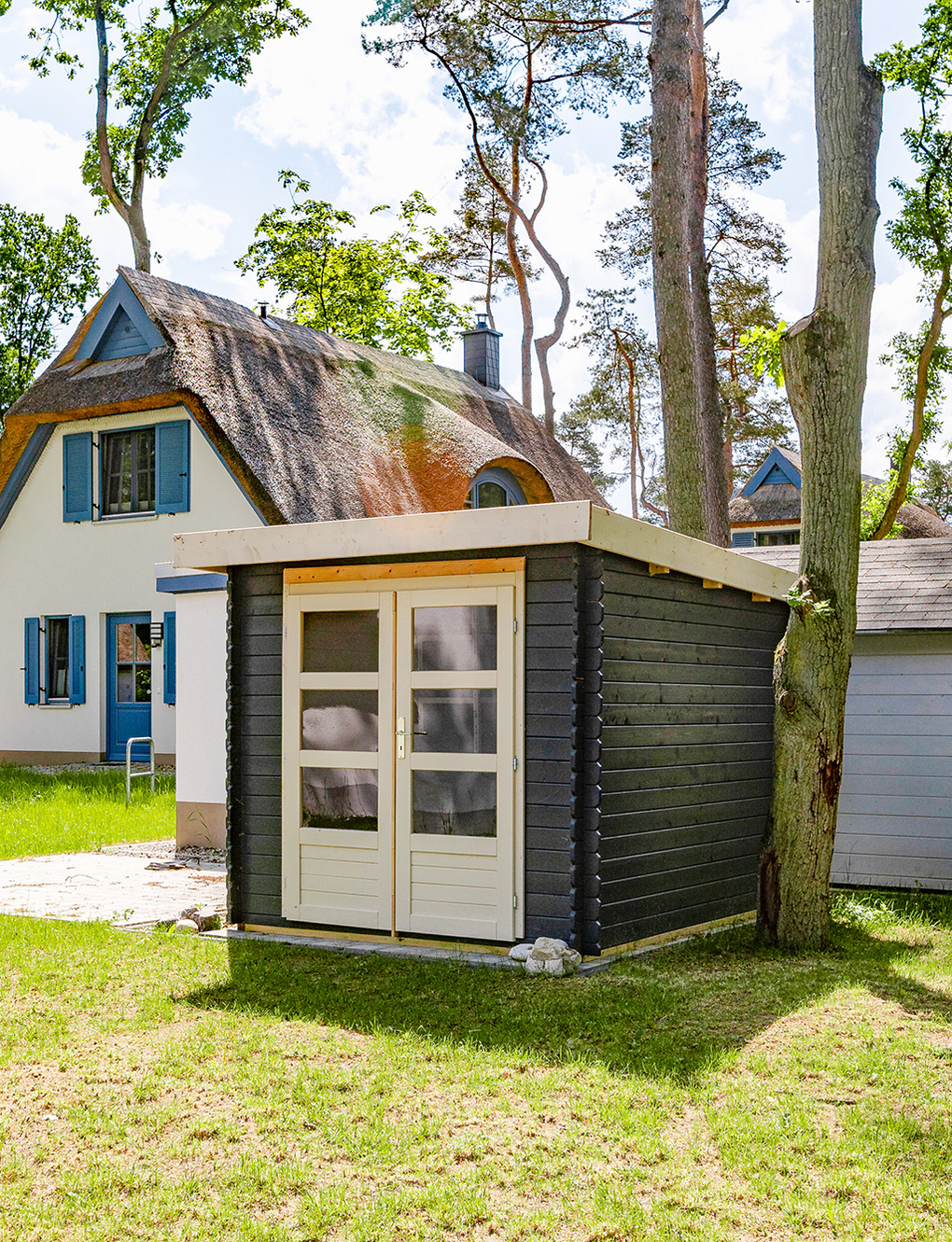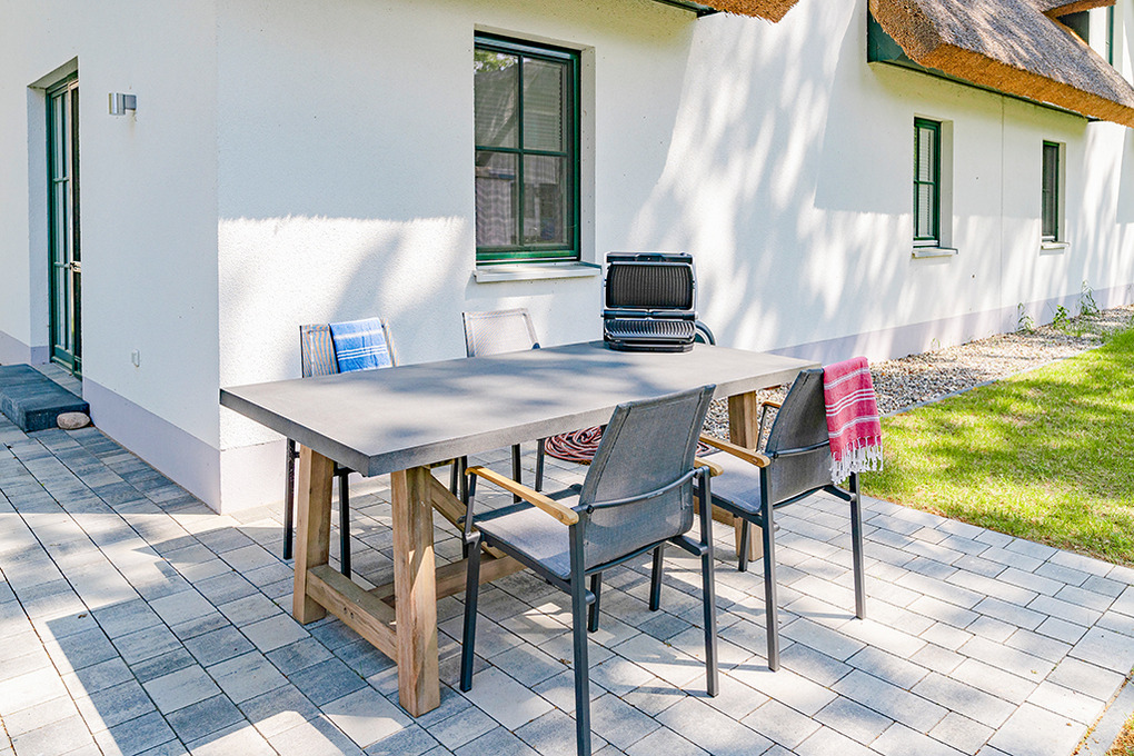 Haus: Großzügig angelegte Ferienhausanlage auf großem gepflegtem Areal (10 ha) mit lichtem Baumbestand. Hochwertige, reetgedeckte Ferienhaushälfte mit Sauna. 2 separate Schlafzimmer, 2 Bäder. Gehobene Ausstattung mit geschmackvoller Möblierung. Zentralheizung. Kostenloser Internetzugang über W-Lan. Terrasse mit Sitzmöbeln. Abstellraum. Tischtennisplatte. 2 Pkw-Stellplätze.