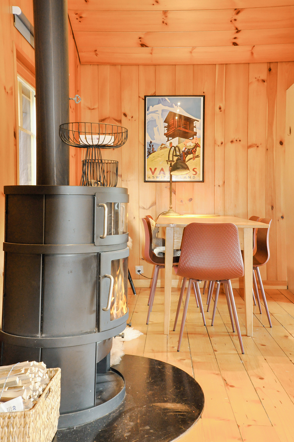 1. Etage: Schöner Wohnraum (30 qm) mit gemütlicher Sofa-Sitzgruppe, Kaminofen, Esstisch, Einbauküche (Backofen, Spülmaschine). Vom Wohnraum aus steile Leiter auf Galerie unterm Dach: 2 Einzelmatratzen unter der Dachschrägen (max. Stehhöhe nur 1,50 m).