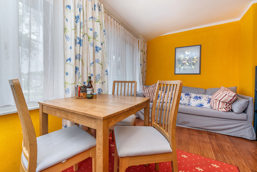 D 98.23 Wohnung 2-3 Pers.: Studio mit 26 qm Wohnfläche, 1.Etage. Wohn-/Schlafraum mit Esstisch, Pantry-Küche (2 P. E-Herd), 2 Einzelbetten, Couchgarnitur (Ausziehcouch 1 Pers.). Bad/WC.