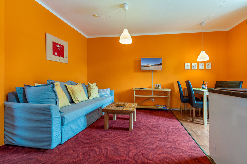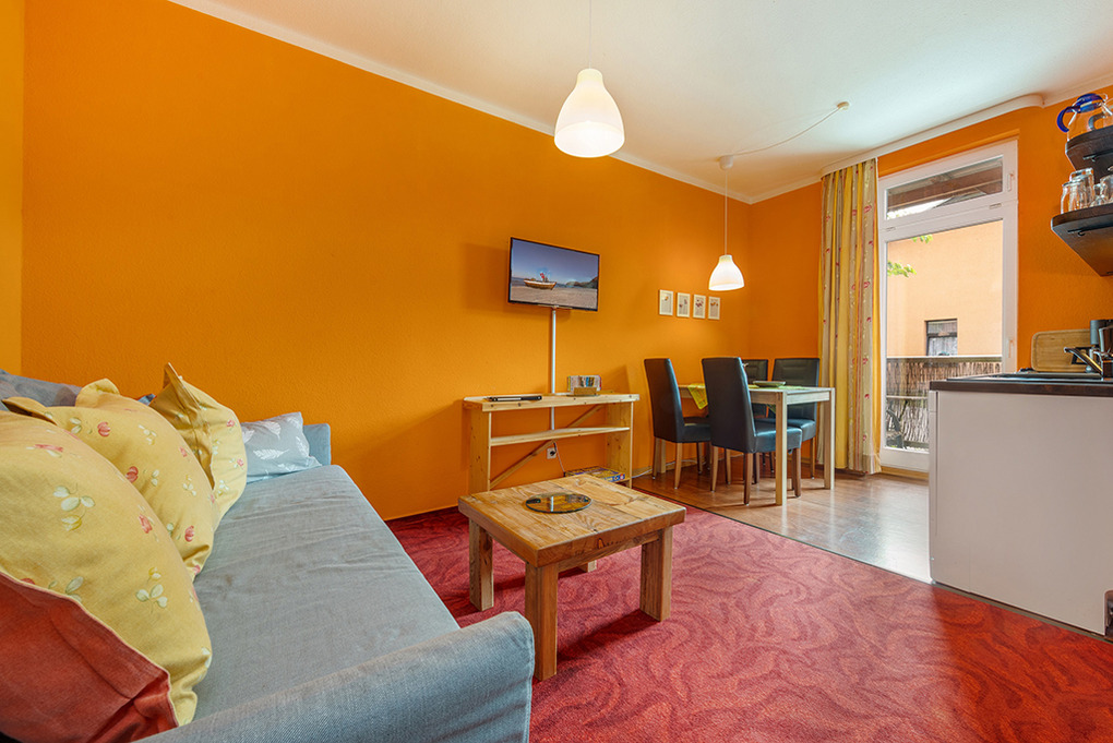 D 98.24 Wohnung 2-4 Pers.: 2-Zimmer-Wohnung mit 38 qm Wohnfläche, Parterre. Wohn-/Essraum mit Couchgarnitur (Ausziehcouch 2 Pers.), Esstisch, Küchenzeile (2 P. E-Herd, Spülmaschine). Doppelzimmer. Bad/WC. Terrasse mit Sitzmöbeln.