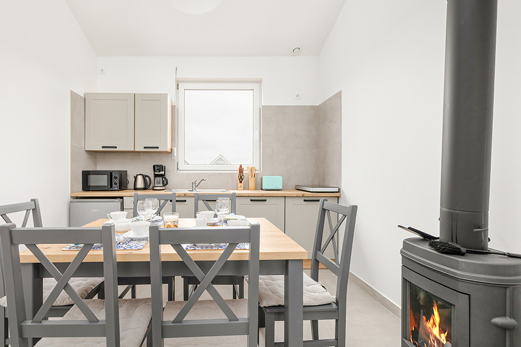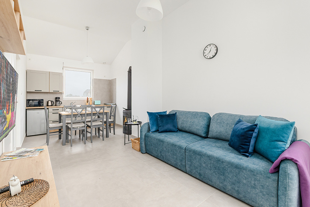 PL 57.14 Ferienhaus 2-4 Pers.: Freundliches 3-Zimmerhaus mit ca. 40 qm Wohnfläche. Wohn-/Essraum, Sitzgarnitur, Sat-TV (deutsche Programme), Esstisch, Küchenzeile (2 Induktionsplatten, Mikrowelle). Doppelzimmer. 2-Bettzimmer. Bad/WC. Terrasse mit Sitzmöbeln.