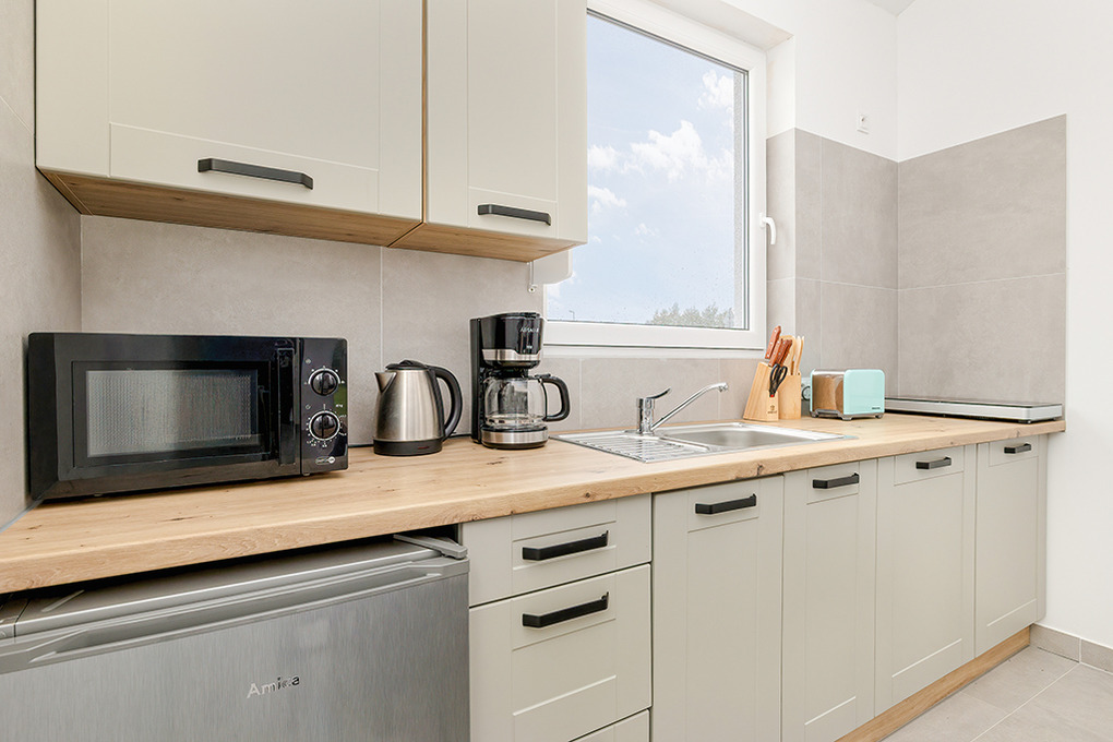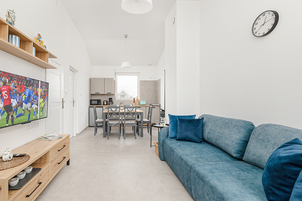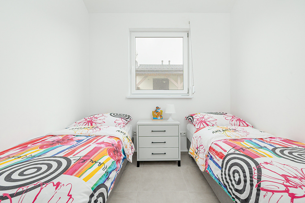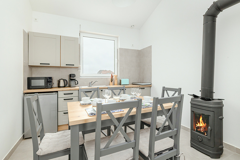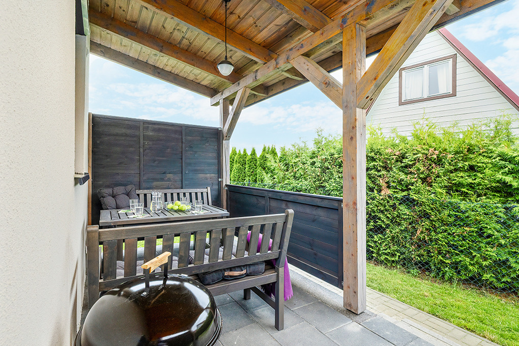 PL 57.14 Ferienhaus 2-4 Pers.: Freundliches 3-Zimmerhaus mit ca. 40 qm Wohnfläche. Wohn-/Essraum, Sitzgarnitur, Sat-TV (deutsche Programme), Esstisch, Küchenzeile (2 Induktionsplatten, Mikrowelle). Doppelzimmer. 2-Bettzimmer. Bad/WC. Terrasse mit Sitzmöbeln.