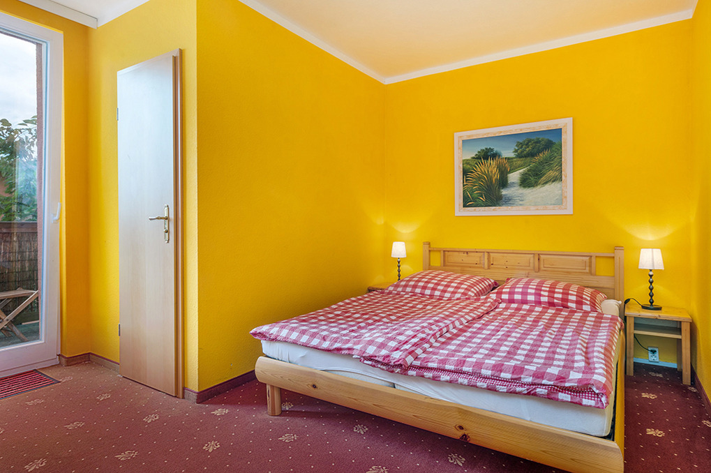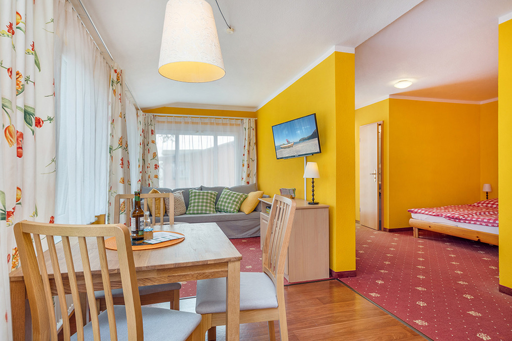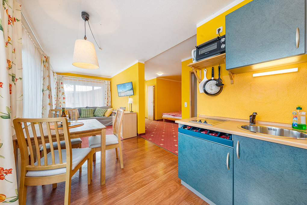 D 98.22 Wohnung 2-3 Pers.: Studio mit 31 qm Wohnfläche, 1.Etage. Wohn-/Schlafraum mit Esstisch, Pantry-Küche (2 P. E-Herd, Spülmaschine), Doppelbett, Couchgarnitur (Ausziehcouch 1 Pers.). Bad/WC. Balkon mit Sitzmöbeln.