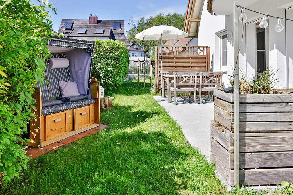 Haus: Schönes Apartmenthaus mit geschmackvoll eingerichteten Ferienwohnungen. Helle Fewo mit Terrasse mit Sitzmöbeln und Strandkorb. Nichtraucherwohnung. Kostenloser Internetanschluss über W-Lan. Zentralheizung. 1 Fahrrad-Stellpatz/ Fewo. 1 Pkw-Stellplatz/Fewo.