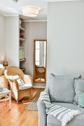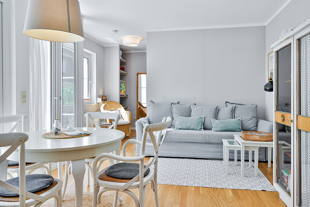 D 66.50 Wohnung 1-2 Pers.: Helles Studio mit 40 qm Wohnfläche, Parterre. Wohn-/Schlafraum mit Esstisch, Sitzgarnitur, Couch, gut ausgestatteter Einbauküche (Backofen, Spülmaschine), Doppelbett in Raumnische, Sat-TV. Bad/WC. Sonnige Terrasse mit Sitzmöbeln, Strandkorb, kleiner Rasenfläche.