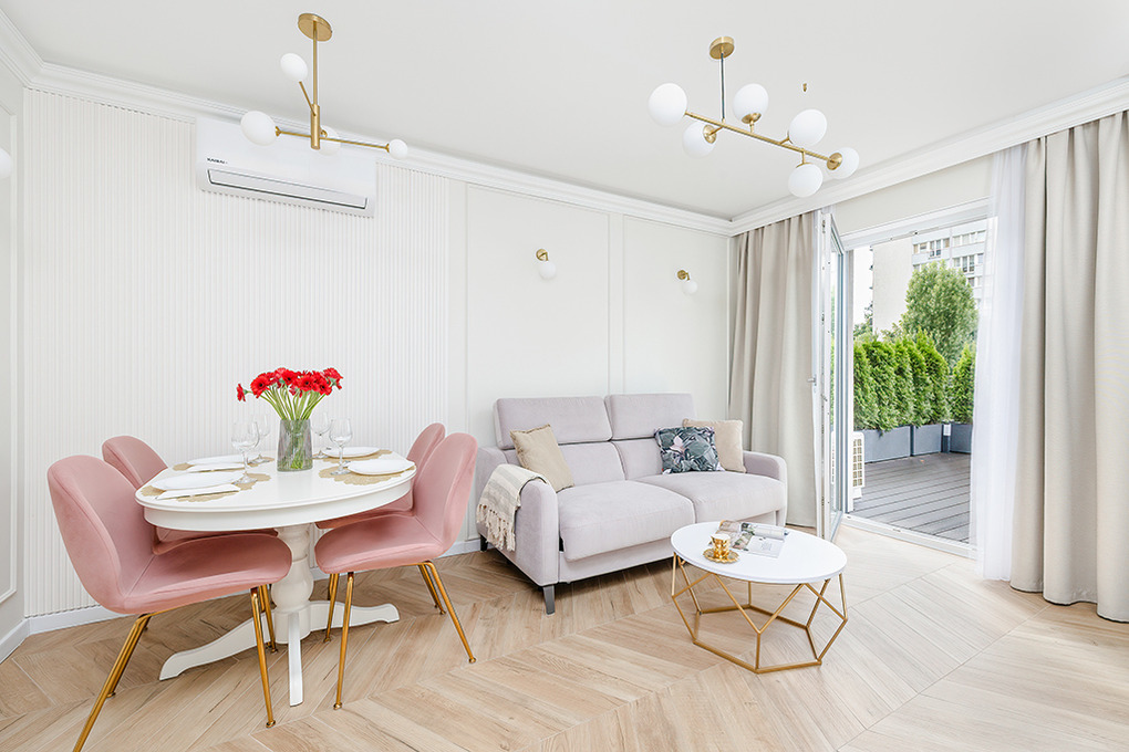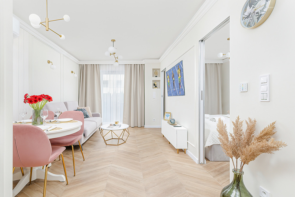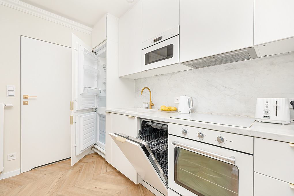 PL 11.14 Wohnung 2-4 Pers. : Exklusiv und mit viel Liebe zum Detail eingerichtete 2-Zimmerwohung mit 42 qm Wohnfläche.1. Etage (Aufzug). Heller Wohn-/Essraum mit bodentiefen Fenstern, hochwertiger Möblierung, Sitzgarnitur (Schlafsofa 2 Pers.), Klimaanlage, Couchtisch, Flachbild-SMART-TV (deutsche Programme), Internet (WLAN). Esstisch, sehr gut ausgestattete Küchenzeile (4 E-Pl. Induktionskochfeld, Dunstabzug, Gefrierschrank, Mikrowelle, Backofen, Spülmaschine). Doppelzimmer mit TV. Bad: Du, Wb, WC, Waschmaschine. Große, teils überdachte Terrasse (30 qm) mit Hollywood-Schaukel und Sitzmöbeln.