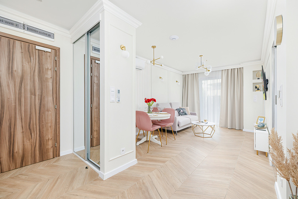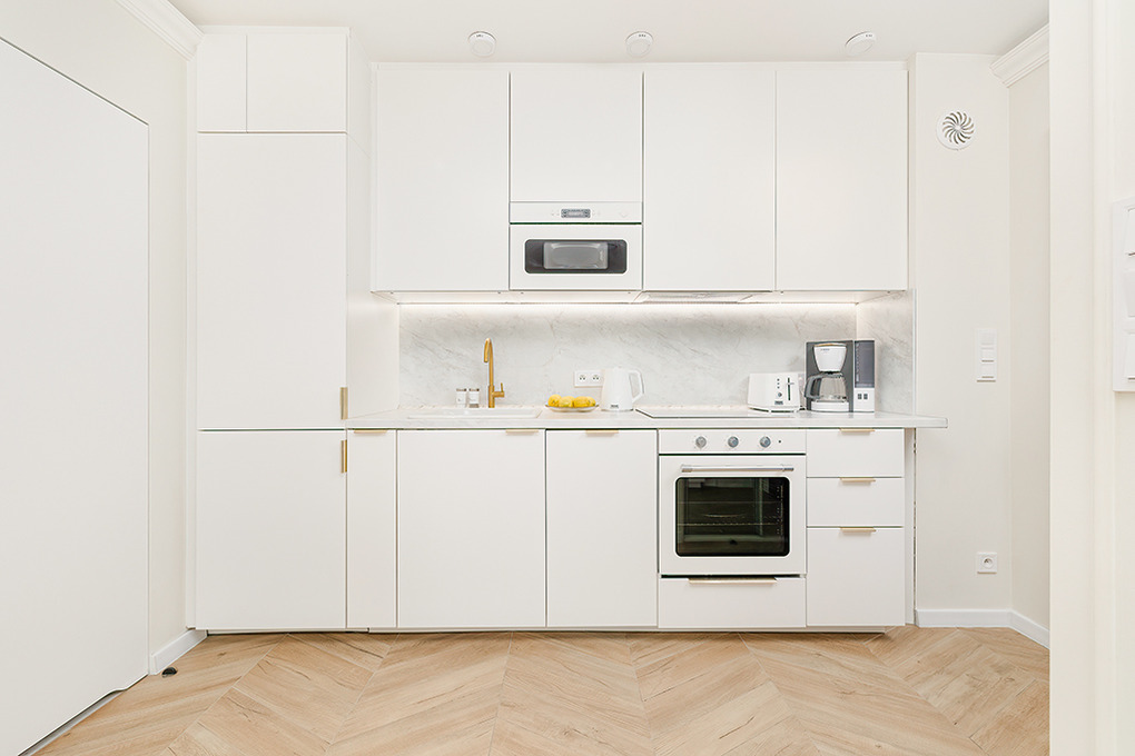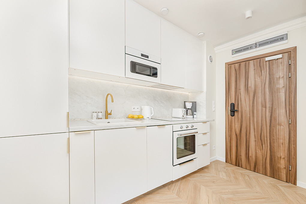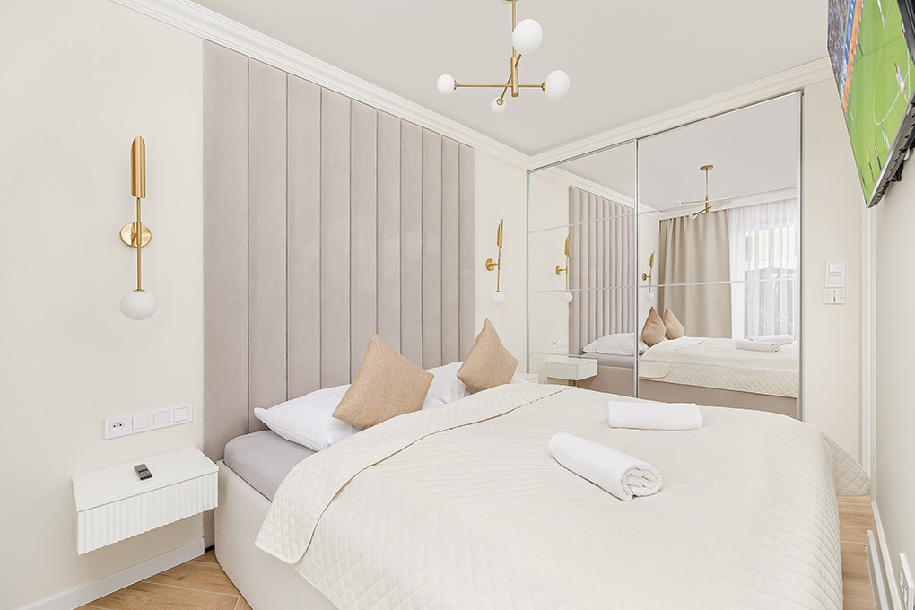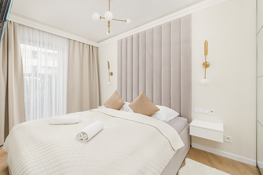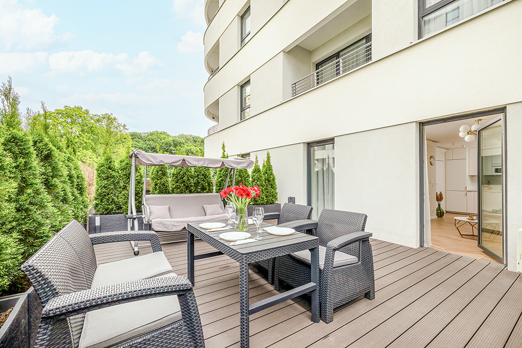 Haus: Moderne Residenz mit komfortablen Ferienwohnungen, 2021 erbaut. Aufzug im Haus. Freundliche, geschmackvolle Einrichtung. Zentralheizung. Klimaanlage. Alle Fewos mit Balkon oder Terrasse (Sitzmöbel). Kostenloser Internetzugang. Ein Pkw-Stellplatz/Fewo in der Tiefgarage (Gebühr).