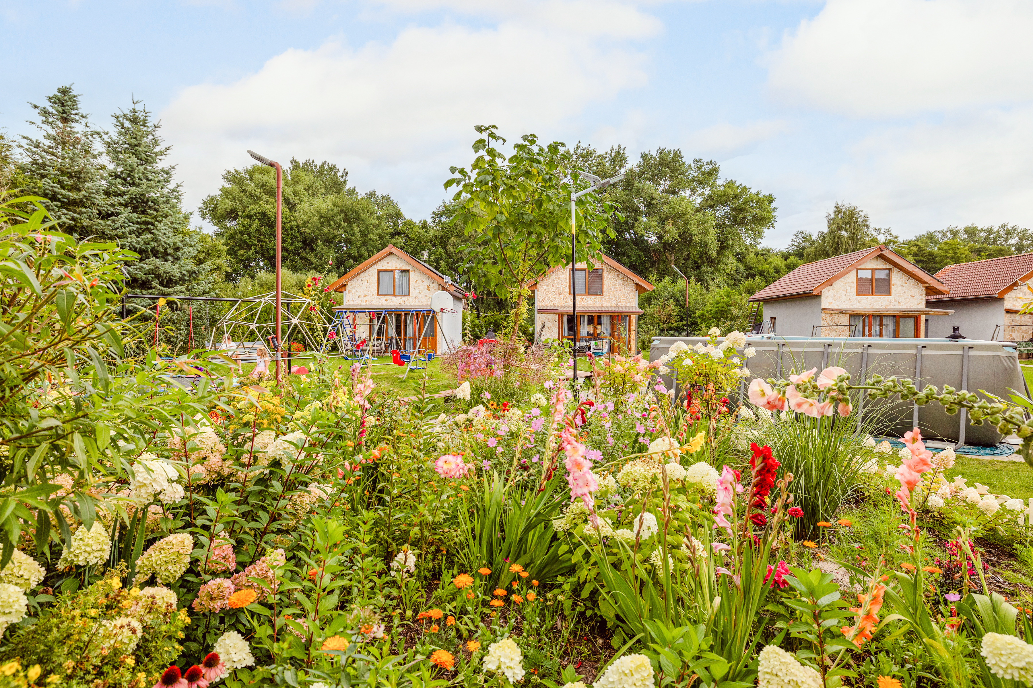 Haus: Sechs schöne Ferienhäuser, 2017-2023 neu erbaut. Ruhige Lage auf einem gepflegten Rasengrundstück (3000 qm). In der Anlage: unbeheizter Swimmingpool (5 x 10 m, Juli – August). Fahrrad-Verleih (Gebühr). Kinderspielplatz mit Schaukel, kleinem Klettergerüst.
