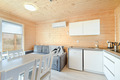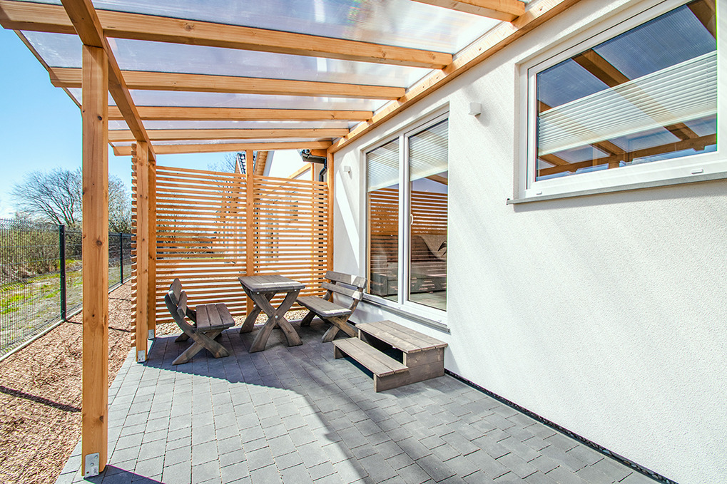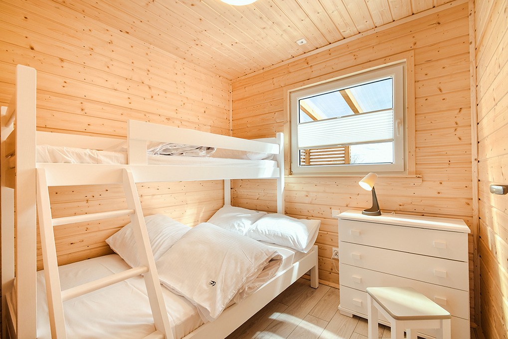 PL 55.34 Ferienhaus 1-5 Pers.: 3-Zimmer-Ferienhaus mit 48 qm Wohnfläche. Wohn-/Essraum mit Sofa, Flachbild Sat-TV mit deutschen Programmen, Esstisch, Küchenzeile (2 Induktionsplatten). Bad/WC. Doppelzimmer mit franz. Doppelbett. 3-Bettzimmer mit Etagenbett für 3 Pers. (unten 140 cm breit, oben 80 cm breit). 2 Terrassen mit Sitzmöbeln, Grill, schönem Blick.