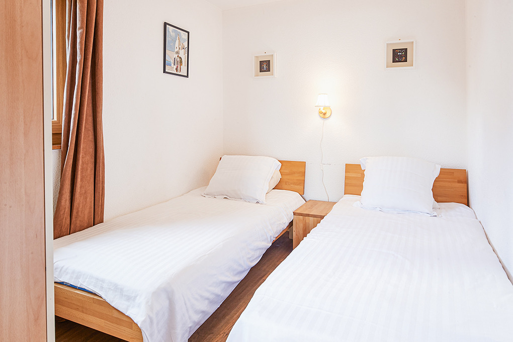 1. Etage (Hanglage): Haupteingang, Flur mit Garderobe. Zwei Doppelzimmer mit Balkon. 2-Bettzimmer. Bad: Bw/Du, Wb, WC.