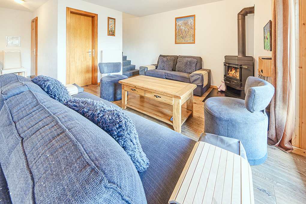 Parterre: Wohnraum (30 qm) mit gemütlicher Sitzgruppe am Kaminofen, Kabel-TV, Blue-Ray, Radio, Esstisch, Einbauküche (Backofen, Mikrowelle, Spülmaschine), Terrasse (schöner Panaromablick, Sitzmöbel). 2-Bettzimmer. Bad: Du, Wb, WC.