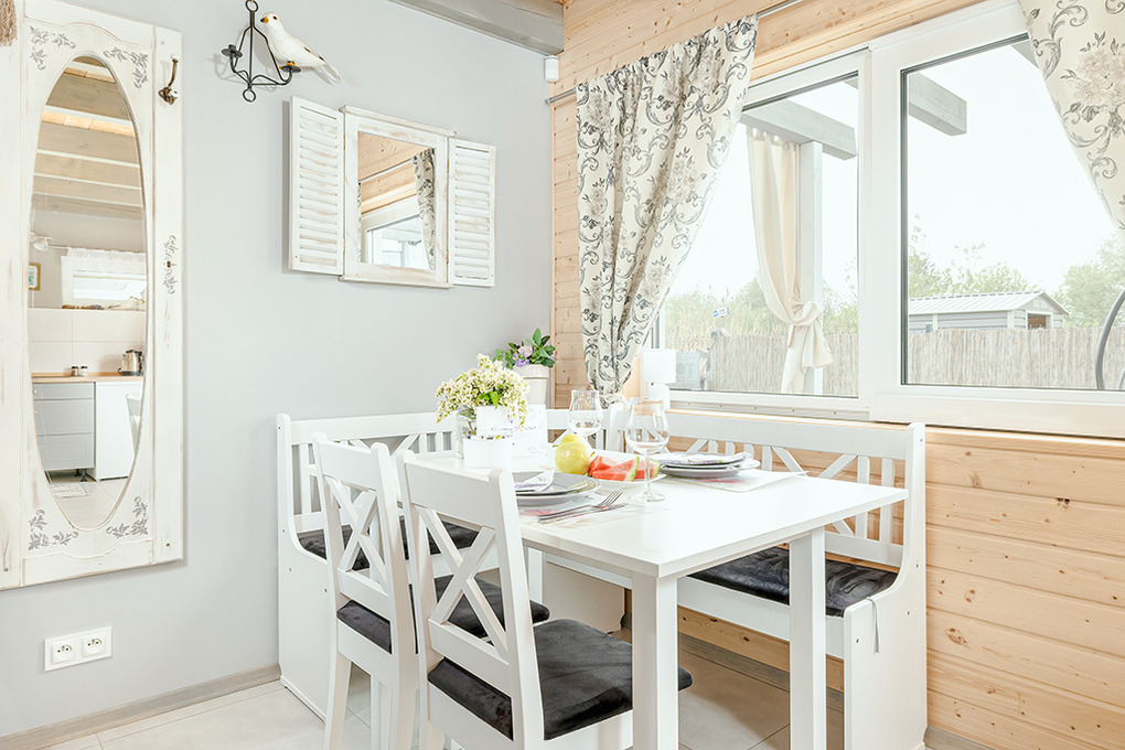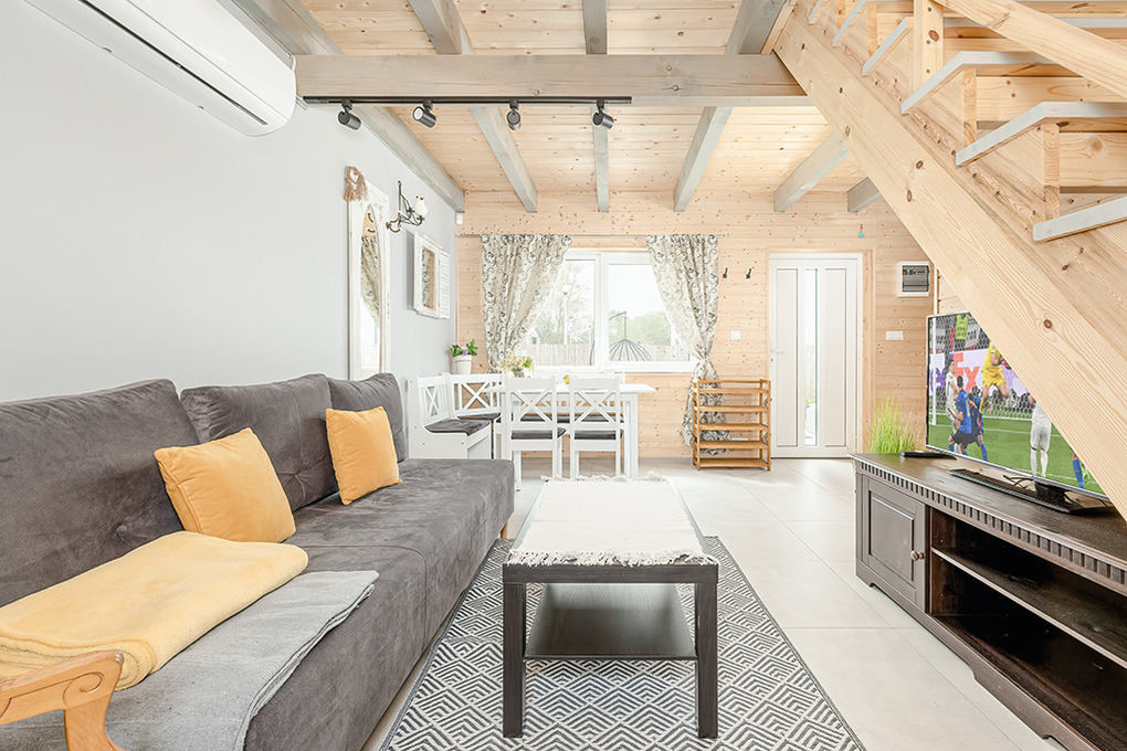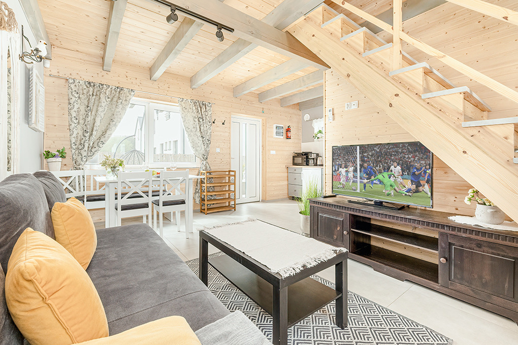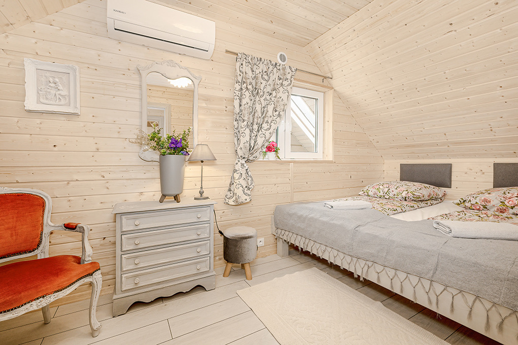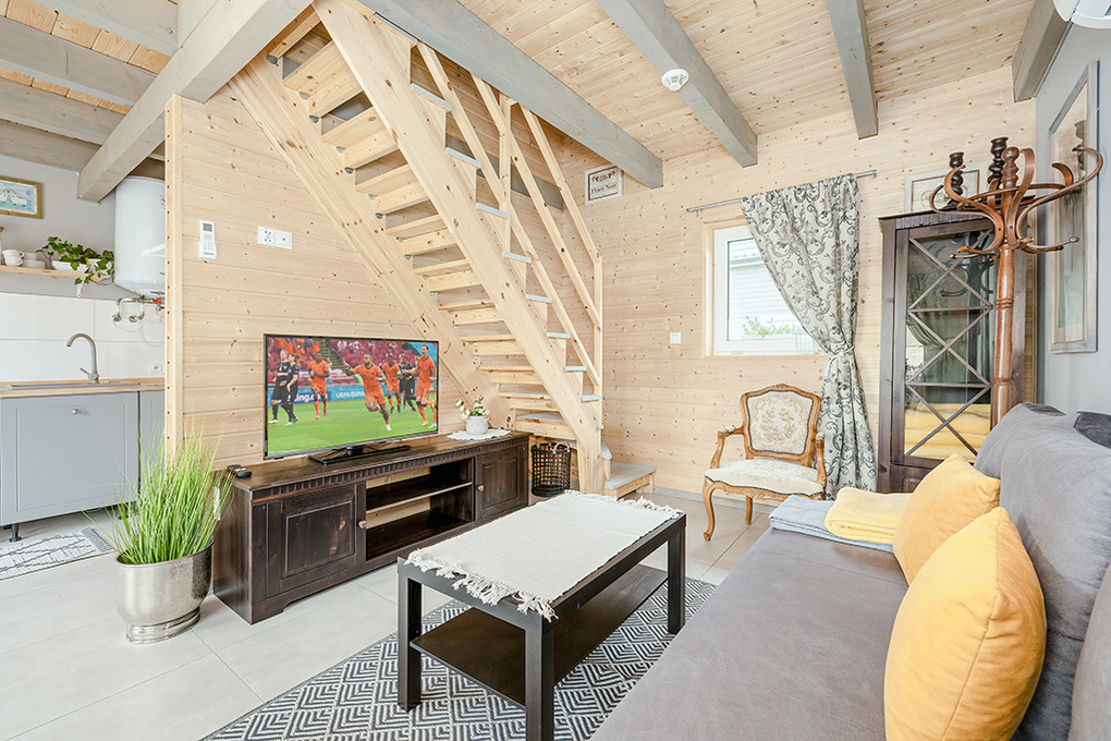 PL 45.5 Ferienhaus 2-6 Pers.: Mit viel Liebe zum Detail eingerichtetes 3-Zimmerhaus mit 60 qm Wohnfläche über zwei Etagen. Parterre: Geräumiger, lichtdurchfluteter Wohn/-Essraum mit Couch (Ausziehcouch 2 Pers), Sat-TV mit dt. Programmen, Internet (WLan über LTE), Esstisch, Küchenzeile (2 Pl. Induktion, Mikrowelle, Spülmaschine). Bad/WC. Vom Wohnraum Holztreppe ins Dachgeschoss mit Schrägen: Doppelzimmer, 2-Bettzimmer mit Eizelbetten. Überdachte Terrasse mit Sitzmöbeln, Poolblick. Die Anlage ist Video-überwacht.