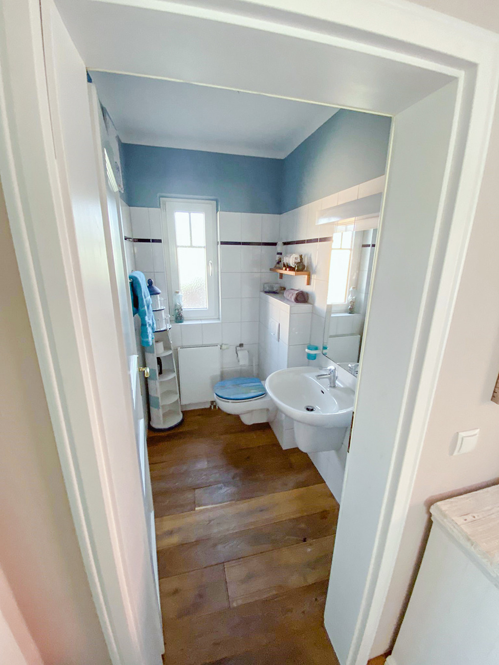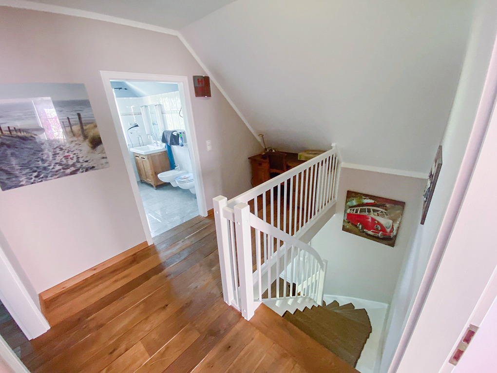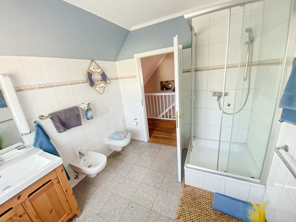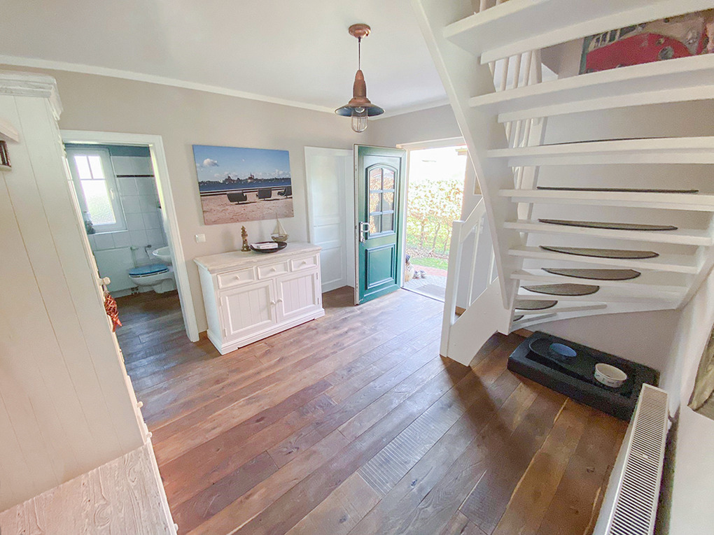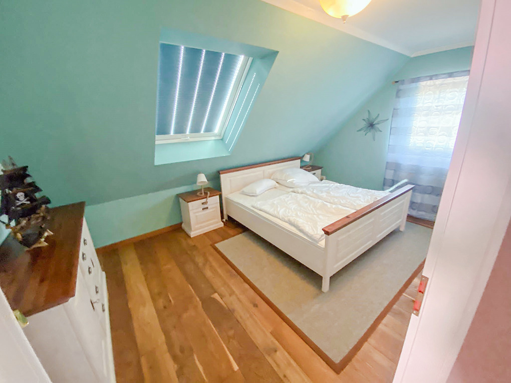 D 128.49 Ferienhaus 1-5 Pers.: 4-Zimmerhaus mit 115 qm Wohnfläche. Parterre: Wohn-/Essraum mit Kaminofen, Couchgarnitur, Sat-TV, Esstisch, Küchenzeile (Spülmaschine, Backofen). Einzelzimmer. Separates WC. Abstellraum mit Waschmaschine. 1. Etage: 2 Doppelzimmer, davon eins mit kleinem Fussballkickertisch. Bad/WC.