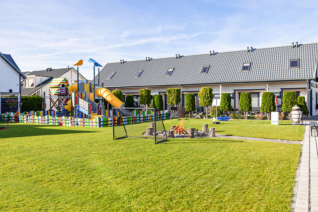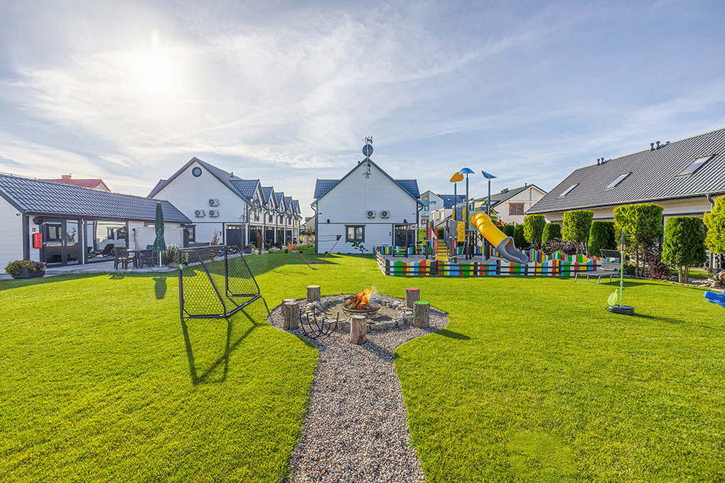 Haus: Gepflegte Ferienhausanlage mit insgesamt 19 schönen Reihenhäusern, 2017 - 2023 erbaut. In der Anlage: Rezeption. Zwei Kinderspielplätze mit Schaukeln, Rutschen, Klettergerüsten, Wippen, Sandkasten. Überdachte Spielecke für Kleinkinder. Tischtennis. Kickertisch, Fahrradverleih. Sauna, Whirlpool (Gebühr). Lagerfeuerstelle.