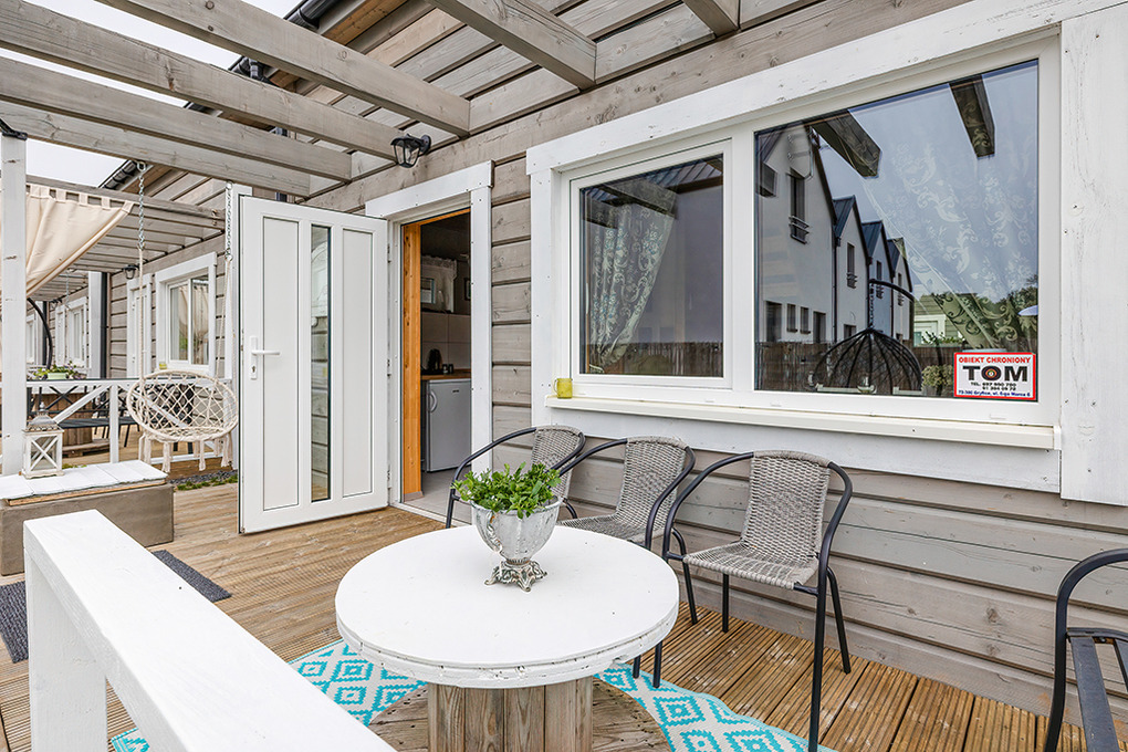 PL 45.5 Ferienhaus 2-6 Pers.: Mit viel Liebe zum Detail eingerichtetes 3-Zimmerhaus mit 60 qm Wohnfläche über zwei Etagen. Parterre: Geräumiger, lichtdurchfluteter Wohn/-Essraum mit Couch (Ausziehcouch 2 Pers), Sat-TV mit dt. Programmen, Internet (WLan über LTE), Esstisch, Küchenzeile (2 Pl. Induktion, Mikrowelle, Spülmaschine). Bad/WC. Vom Wohnraum Holztreppe ins Dachgeschoss mit Schrägen: Doppelzimmer, 2-Bettzimmer mit Eizelbetten. Überdachte Terrasse mit Sitzmöbeln, Poolblick.