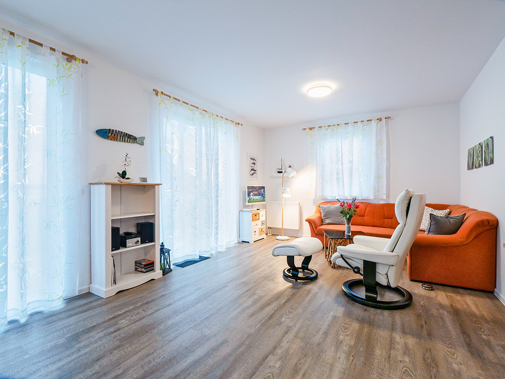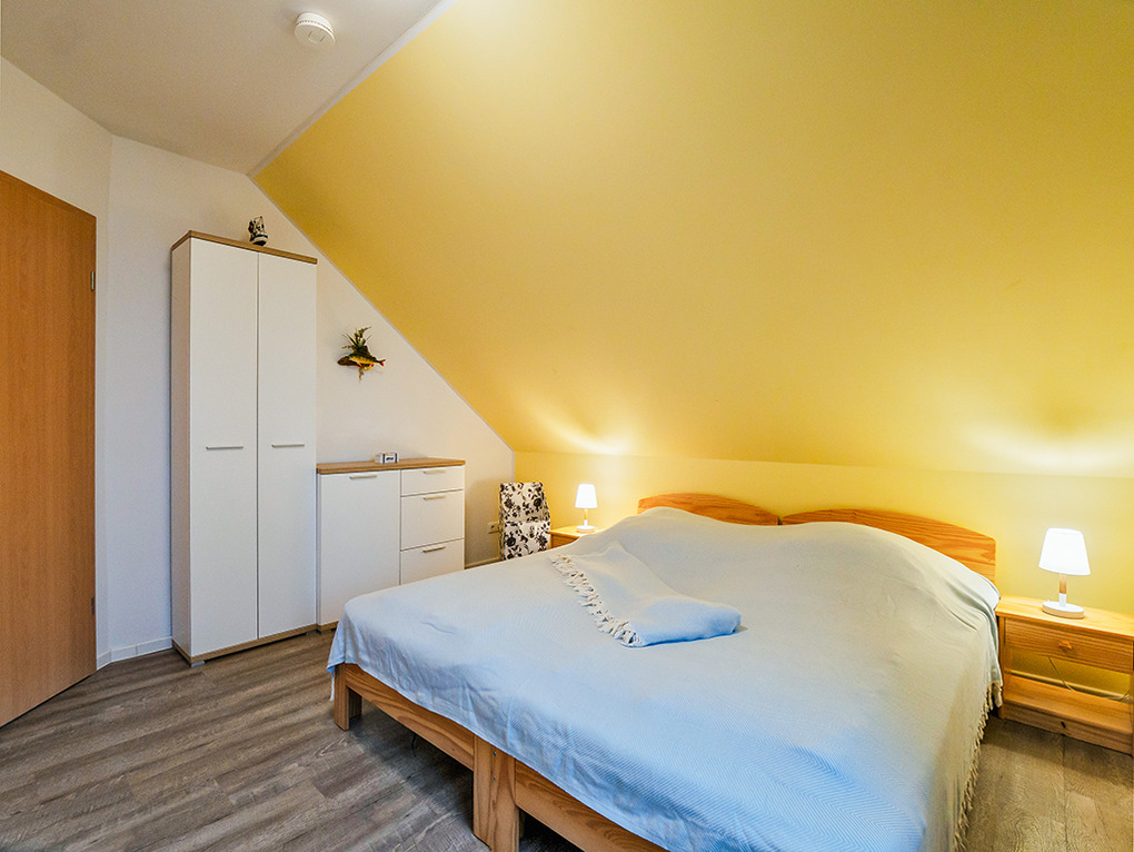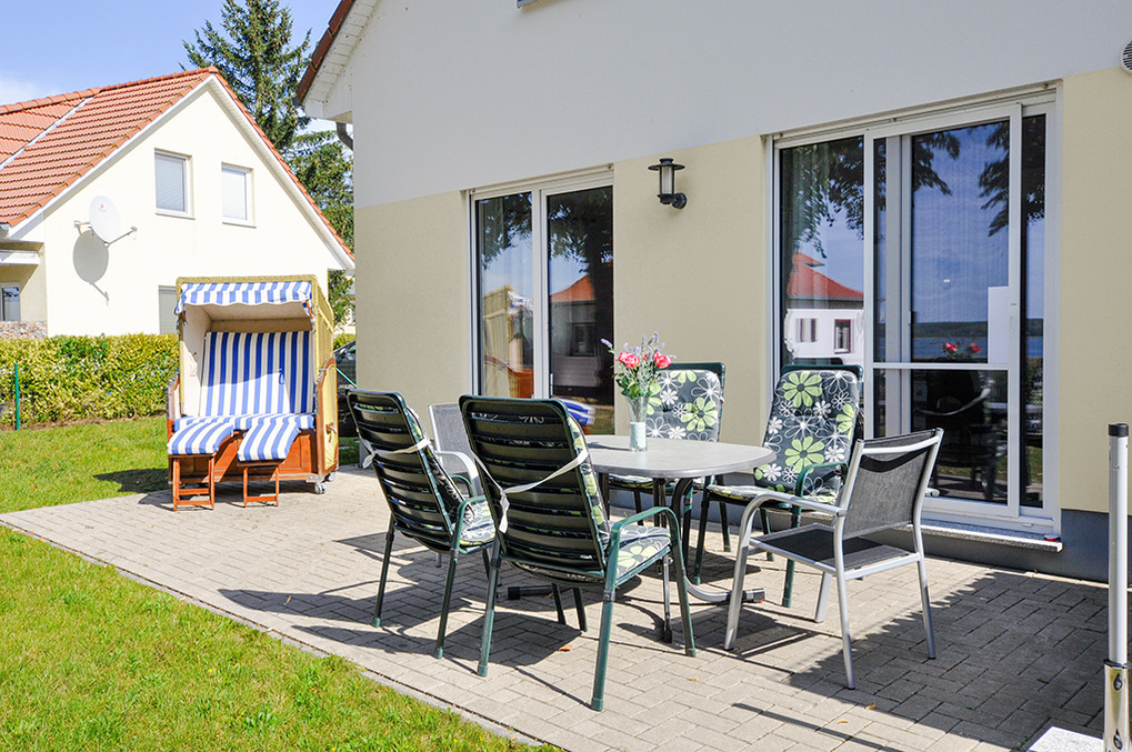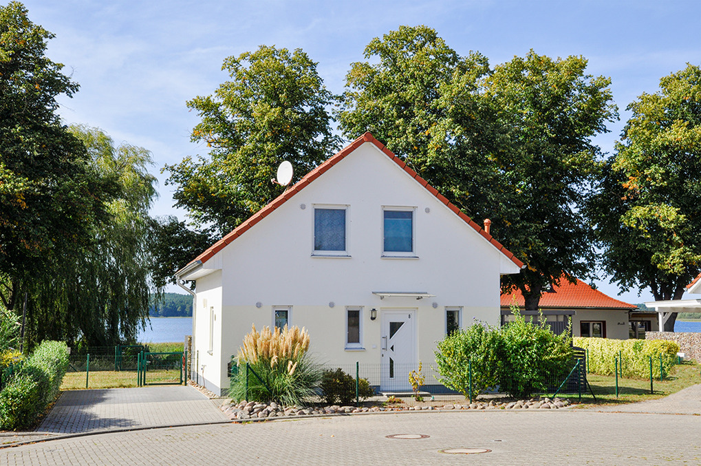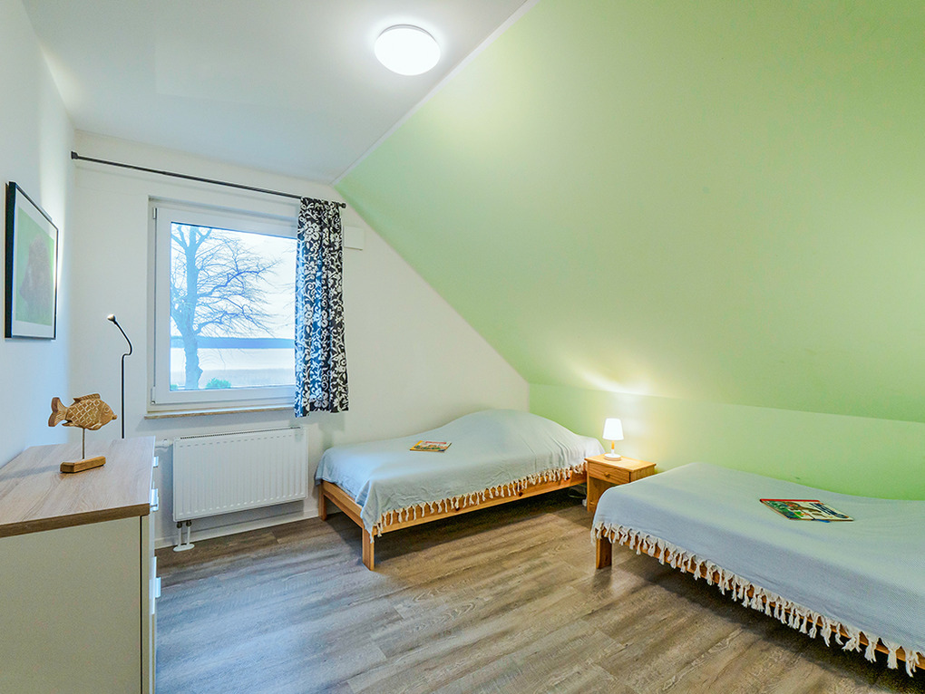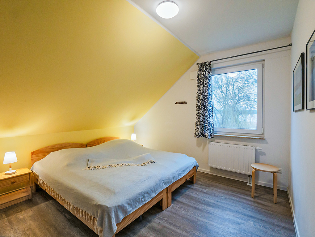 D 45.51 Ferienhaus 2-6 Pers.: Modernes 4-Zimmerhaus mit 100 qm Wohnfläche über 2 Etagen. Parterre: Wohn-/Essraum mit Seeblick, Sitzgruppe, Ruhesessel, Sat-TV, Blu-Ray, Radio/CD, Esstisch, gut ausgestatteter Einbauküche (Backofen, Mikrowelle, Spülmaschine), Terrasse. Separates WC. 1. Etage (leichte Schrägen): Doppelzimmer mit Seeblick. 2-Bettzimmer mit Seeblick. Weiteres 2-Bettzimmer. Bad: Du, Bw, Wb, WC.