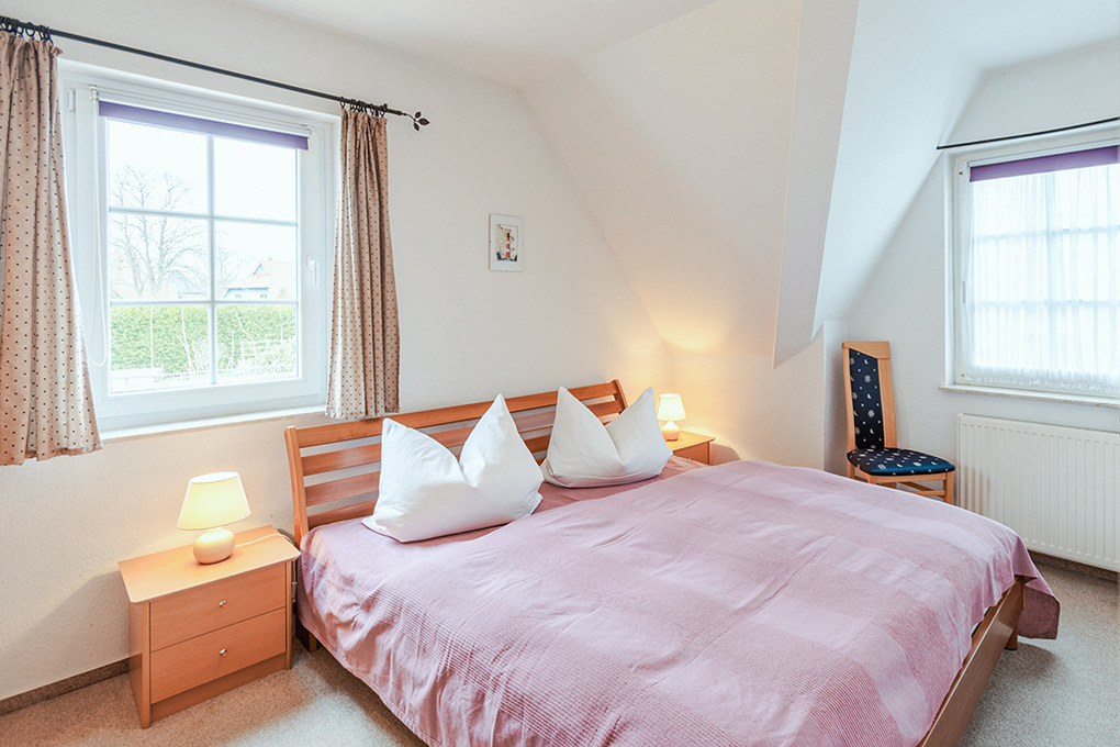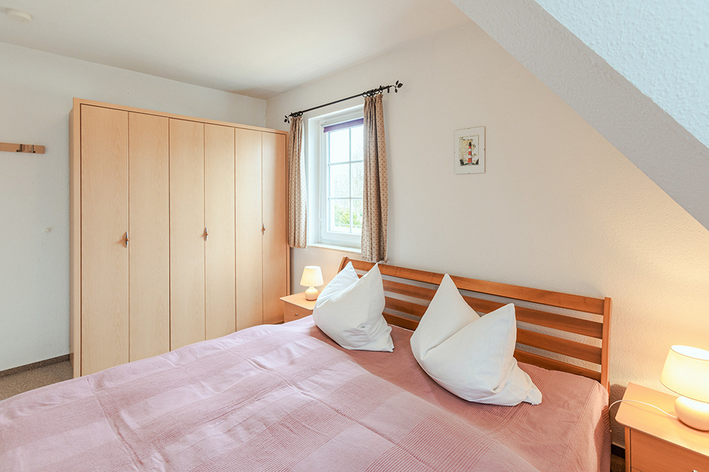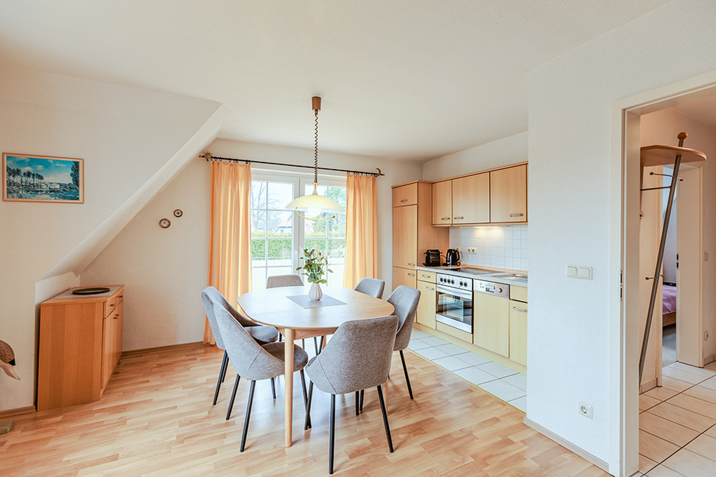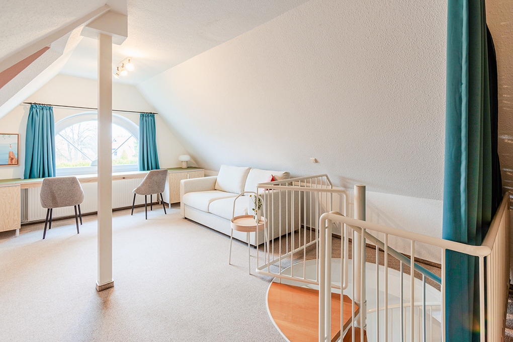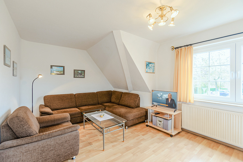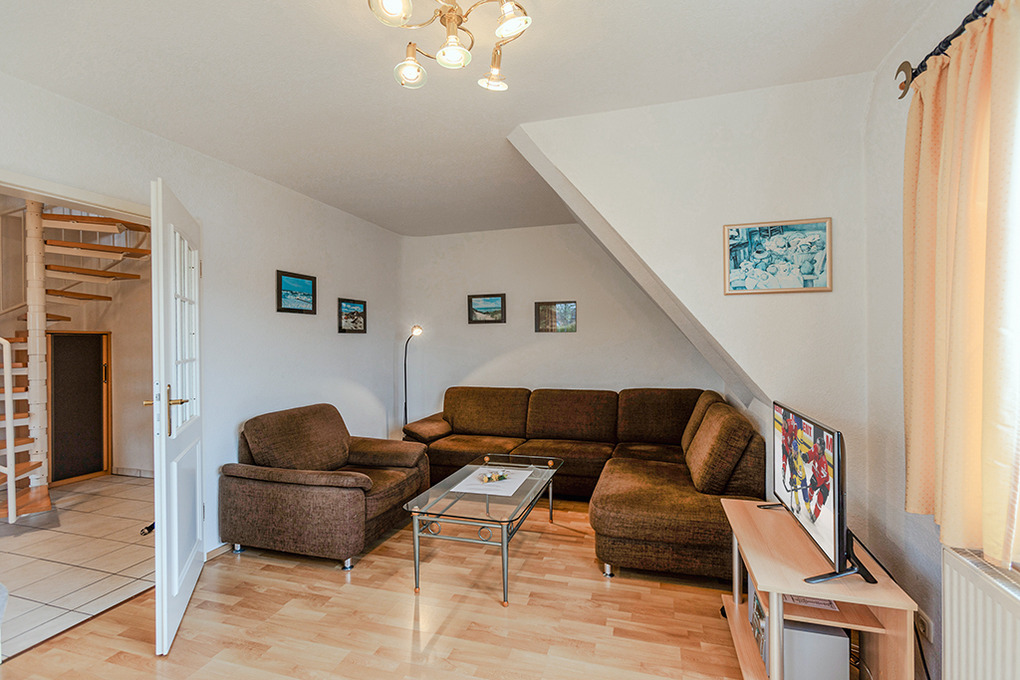 D 67.6103 Wohnung 1-4 Pers.: Großzügige 3-Zimmerwohnung mit 77 qm Wohnfläche über 2 Etagen, 1. Etage. Wohn-/Essraum mit Couchgarnitur, Sat-TV, Mini-Stereoanlage, Esstisch, Küchenzeile (Backofen, Nespresso-Maschine, Spülmaschine). Doppelzimmer. Bad/WC. Treppe ins ausgebaute Dachgeschoss (offen zum Flur): 3-Bettzimmer mit 2 Einzelbetten (Boxspringbetten), Ausziehcouch (1 Pers.), gemütlicher Sitzecke. Großer Balkon mit Sitzmöbeln.