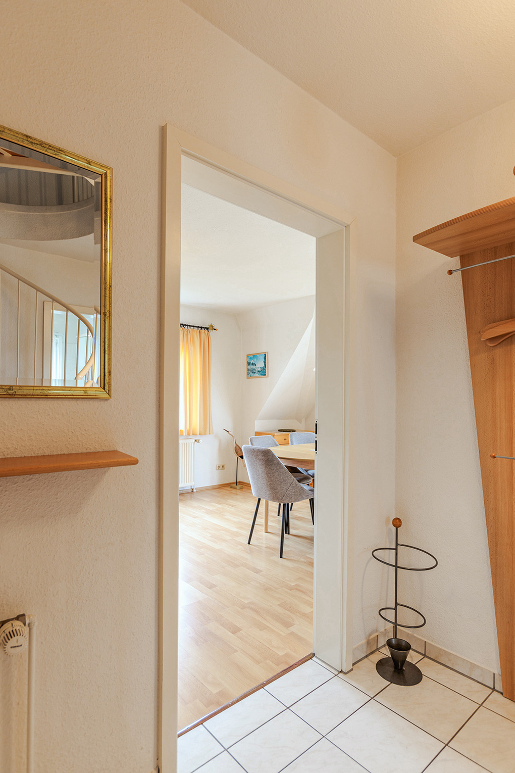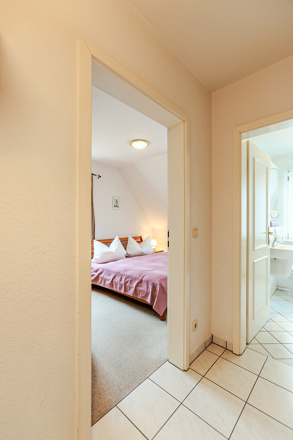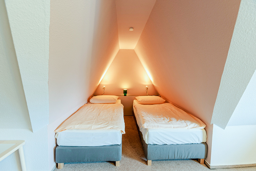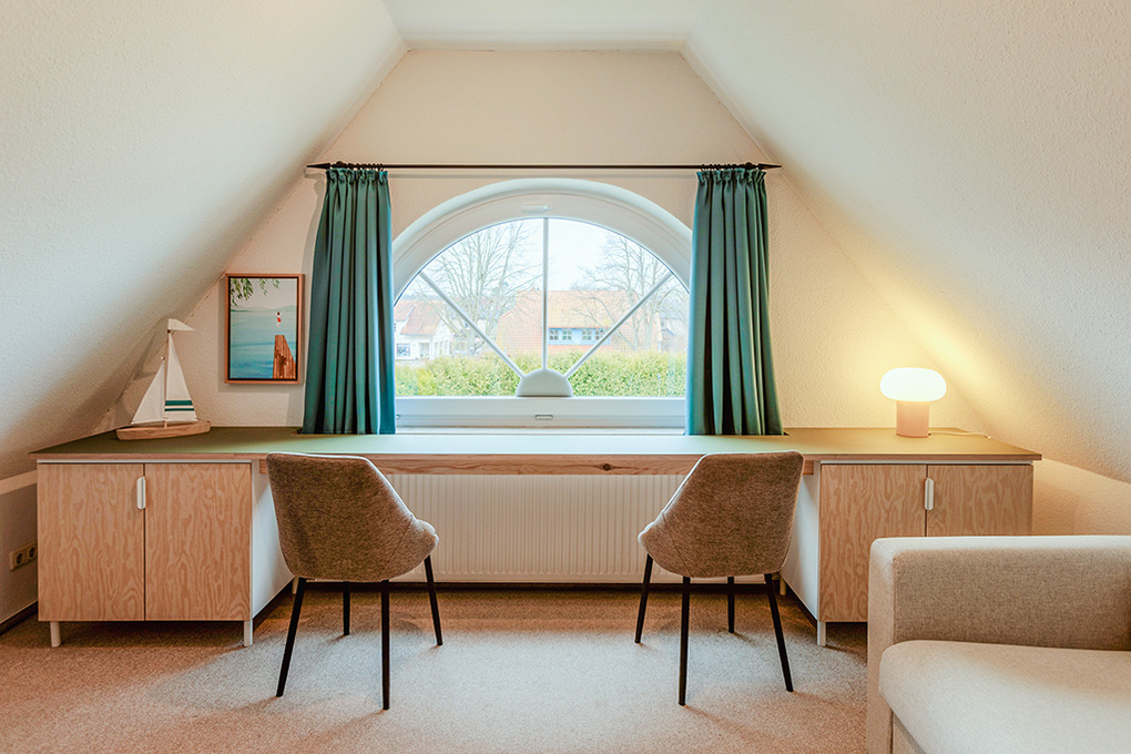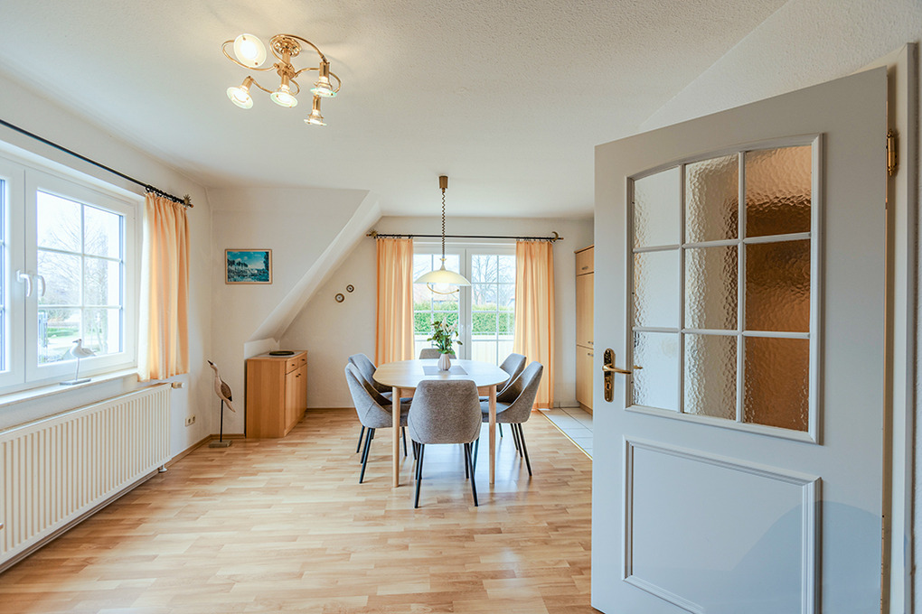 D 67.6103 Wohnung 1-4 Pers.: Großzügige 3-Zimmerwohnung mit 77 qm Wohnfläche über 2 Etagen, 1. Etage. Wohn-/Essraum mit Couchgarnitur, Sat-TV, Mini-Stereoanlage, Esstisch, Küchenzeile (Backofen, Nespresso-Maschine, Spülmaschine). Doppelzimmer. Bad/WC. Treppe ins ausgebaute Dachgeschoss (offen zum Flur): 3-Bettzimmer mit 2 Einzelbetten (Boxspringbetten), Ausziehcouch (1 Pers.), gemütlicher Sitzecke. Großer Balkon mit Sitzmöbeln.