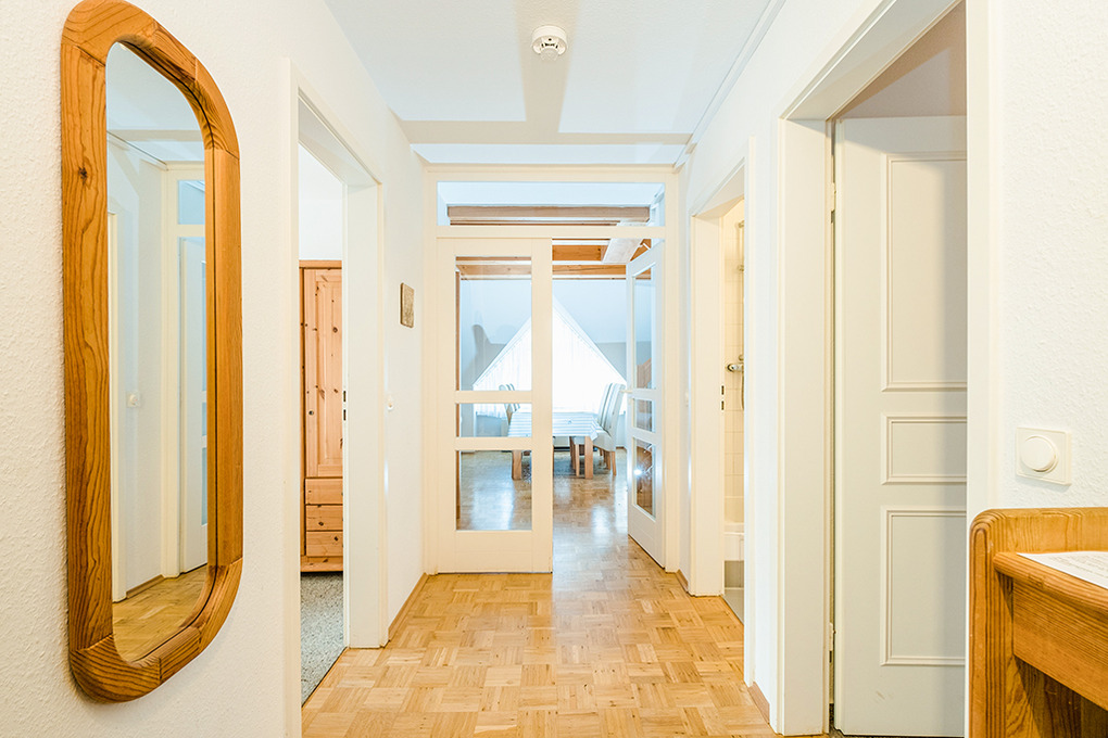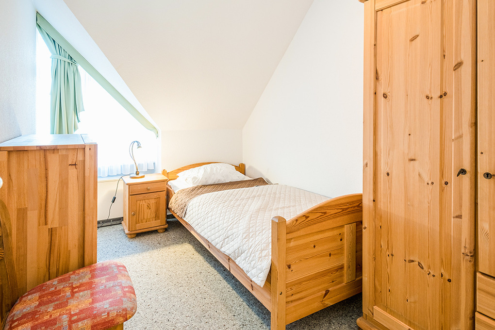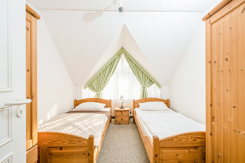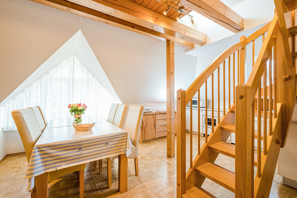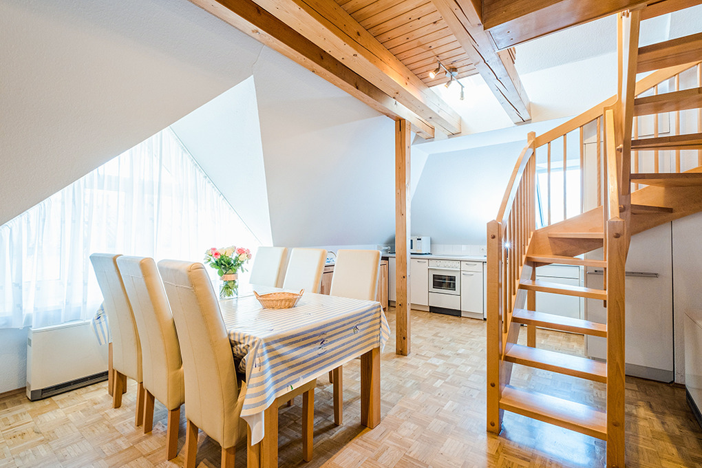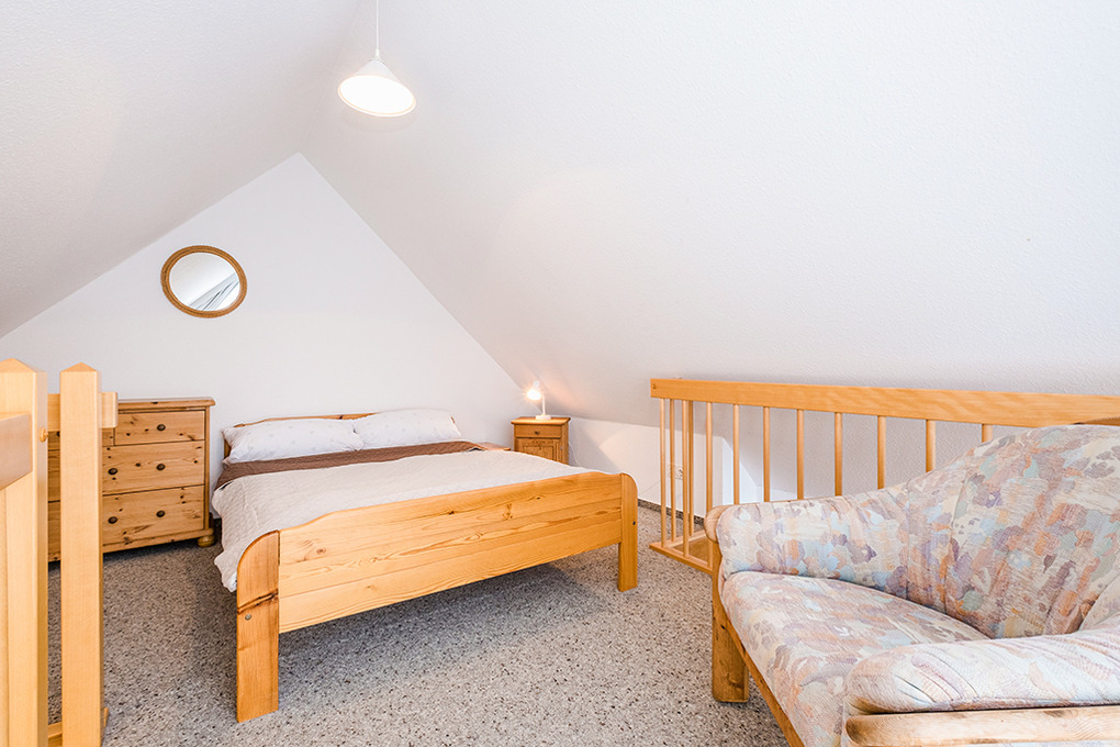 D 66.7 Wohnung 2-5 Pers.: Geräumige 4-Zimmerwohnung mit 75 qm Wohnfläche. 1. Etage: Heller, freundlicher Wohn-/Essraum mit Couchgarnitur, Flachbild-Sat-TV, Radio, Esstisch, gut ausgestatteter Küchenzeile (Backofen, Mikrowelle, Spülmaschine). 2-Bettzimmer. Einzelzimmer. Bad/WC. Treppe ins ausgebaute Dachgeschoss: Galerie, offen zum Wohnraum, mit franz. Bett.