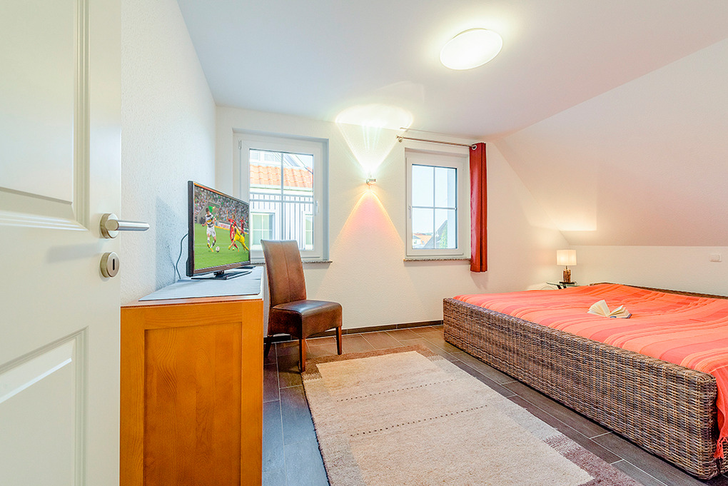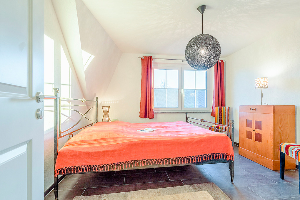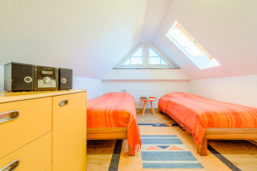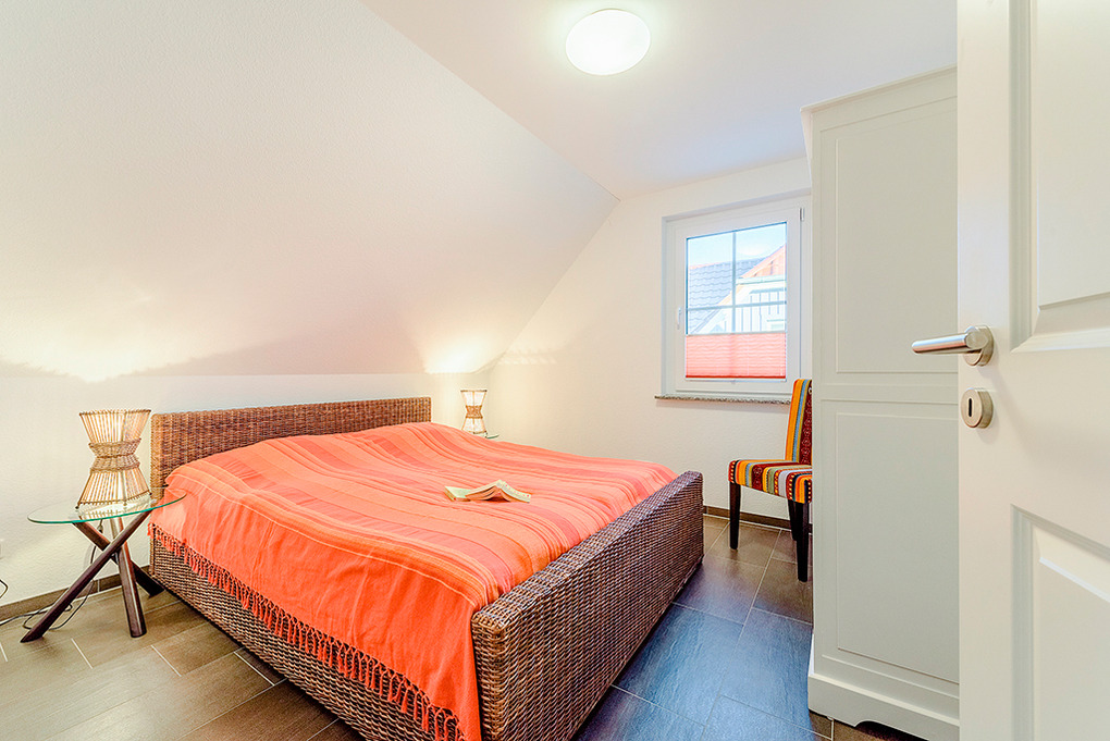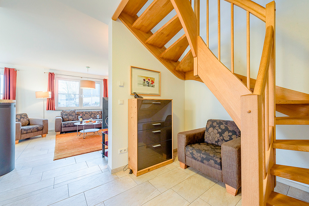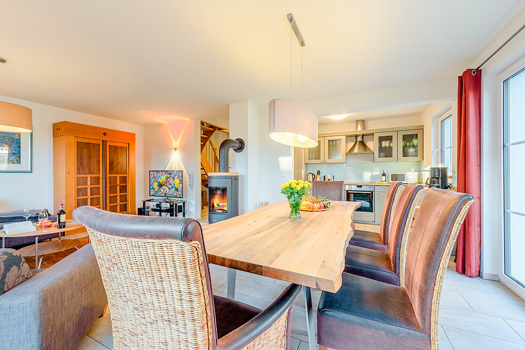D 67.7 Ferienhaus 1-8 Pers.: Komfortable 5-Zimmerhaushälfte mit 115 qm Wohnfläche über 3 Etagen. Parterre: Großzügiger Wohn-/Essraum (35 qm) mit Kaminofen, Couchgarnitur, Flachbild-Sat-TV, DVD, Radio-CD, gemütlichem Essbereich, gut ausgestatteter Einbauküche (Backofen, Mikrowelle, Spülmaschine). Bad: Sauna, Du, Wb, WC. 1. Etage: 3 Doppelzimmer, eins davon mit Sat-TV. Bad: Eck-Bw, Du, Wb, WC, Fön. Treppe in den Spitzboden: 2-Bettzimmer mit Radio/CD.