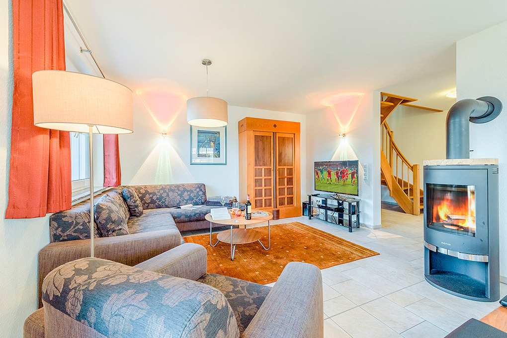 Haus: Exklusive Doppelhaushälfte mit Sauna und Kaminofen, 2013 neu erbaut. Das Haus besticht durch sein großes Platzangebot: 115 qm Wohnfläche, 4 Schlafzimmer, 2 Bäder. Gehobene Ausstattung mit moderner, geschmackvoller Einrichtung. Kostenloser Internetanschluss über W-Lan. Zentralheizung. Nichtraucherhaus. Terrasse mit Sitzmöbeln. 2 Pkw-Stellplätze am Haus.