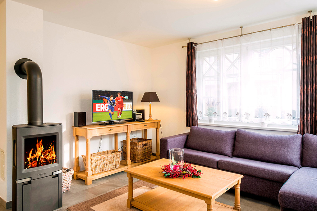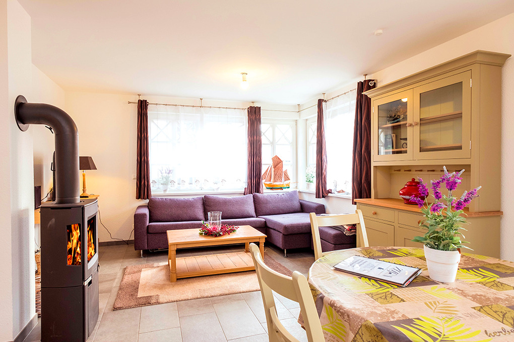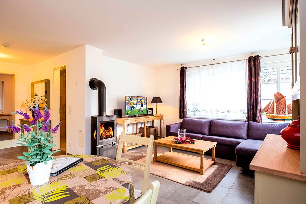 D 67.67A Wohnung 1-2 Pers.: 2-Zimmerwohnung mit 50 qm Wohnfläche, Parterre. Wohn-/Essraum mit Kaminofen, Couchgarnitur, Sat-TV, DVD, Stereoanlage, Esstisch, gut ausgestatteter Küchenzeile (Backofen, Spülmaschine). Doppelzimmer. Bad/WC. Terrasse mit Sitzmöbeln, anschließend schöner Garten.