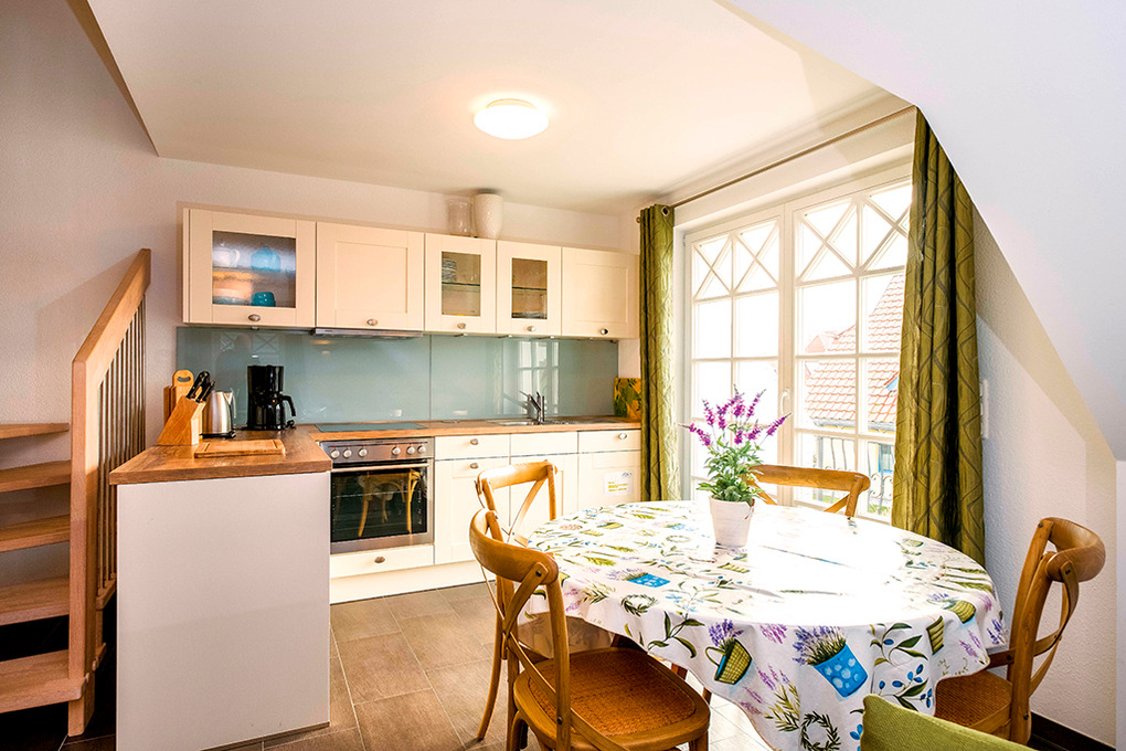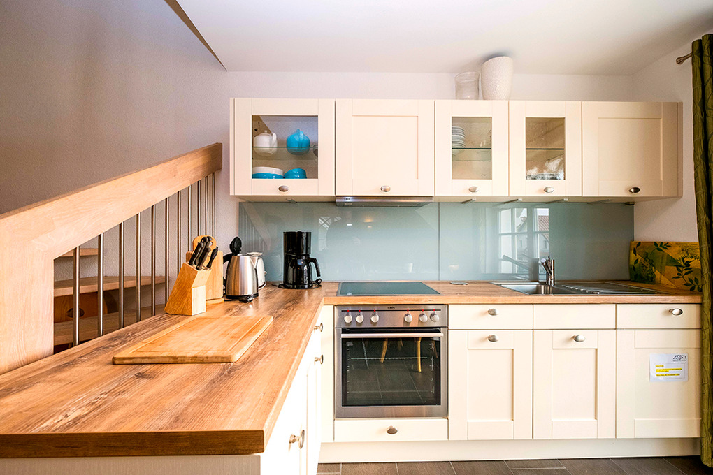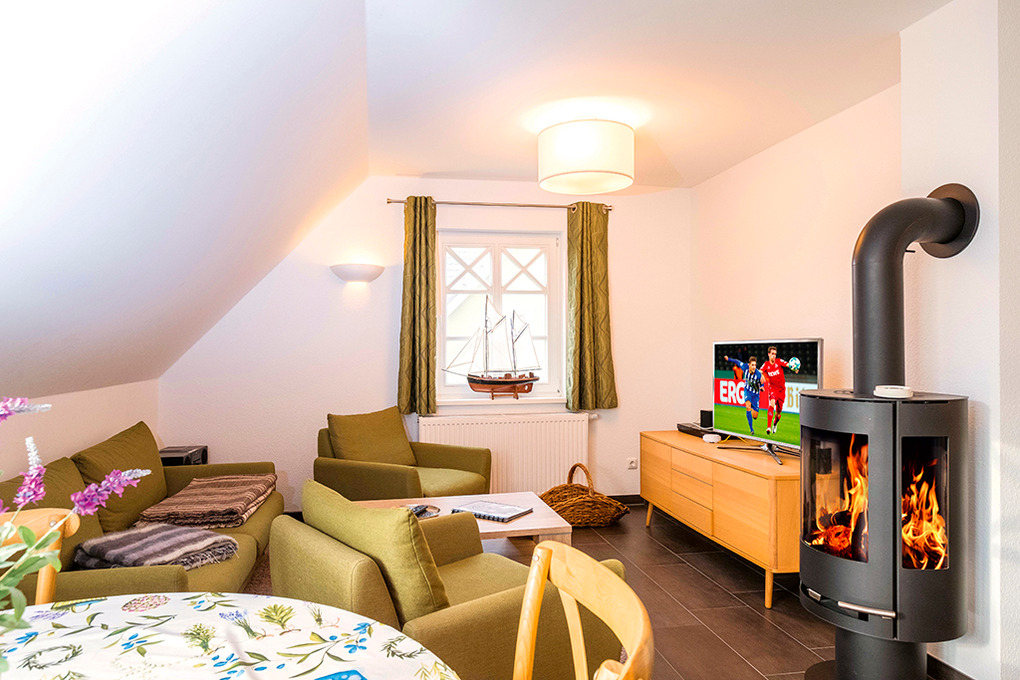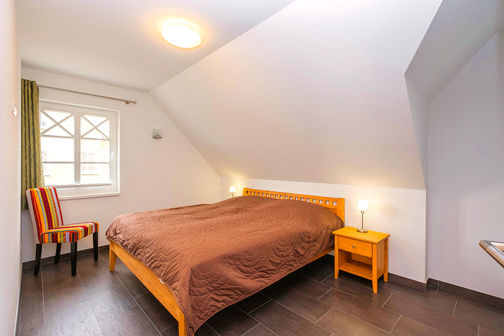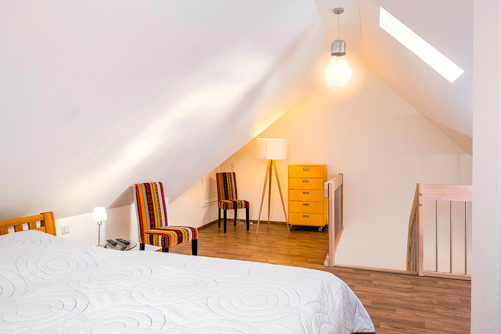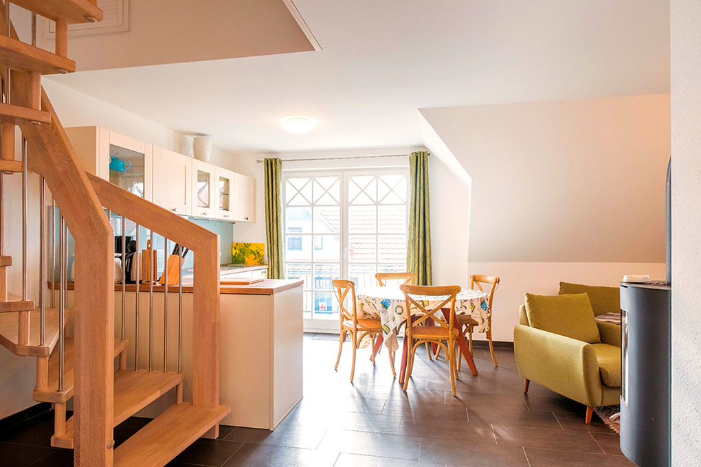 D 67.68 Wohnung 1-4 Pers.: 3-Zimmerwohnung mit 60 qm Wohnfläche über 2 Etagen, 1. Etage. Wohn-/Essraum mit Kaminofen, Couchgarnitur, Sat-TV, Blu-Ray Player, Stereoanlage, Esstisch, gut ausgestatteter Küchenzeile (Backofen, Spülmaschine). Doppelzimmer. Bad/WC. Treppe ins ausgebaute Dachgeschoss: Doppelzimmer mit Sat-TV, Couch. Balkon mit Sitzmöbeln.