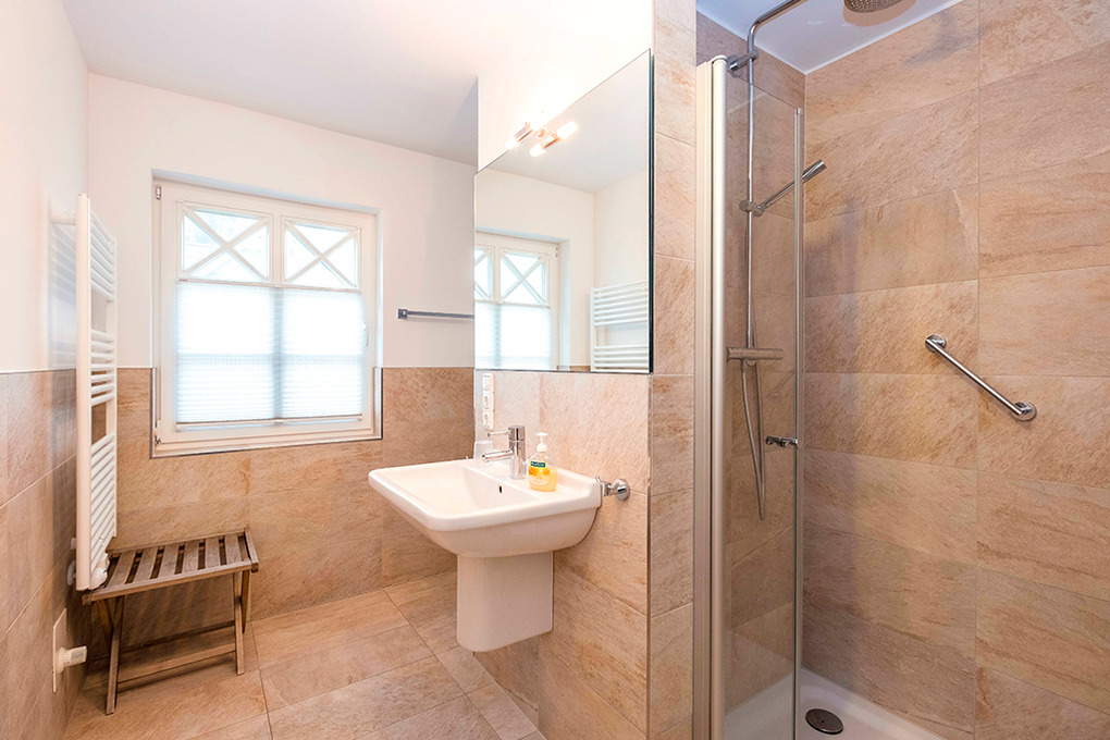 Haus: Regionstypisches Darßer Apartmenthaus, 2014 neu erbaut. Vier geschmackvoll eingerichtete, komfortable Ferienwohnungen im Landhausstil. Jede Fewo mit Kaminofen, Sat-TV, DVD, Stereoanlage, Terrasse mit Garten oder Balkon (jeweils mit Sitzmöbeln). Nichtraucherwohnungen. Kostenloser Internetzugang über W-Lan. Zentralheizung. Waschmaschine, Trockner im Haus (Gebühr). 1 Pkw-Stellplatz, 1 Fahrradschuppen pro Fewo.