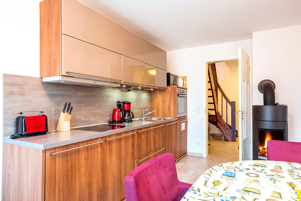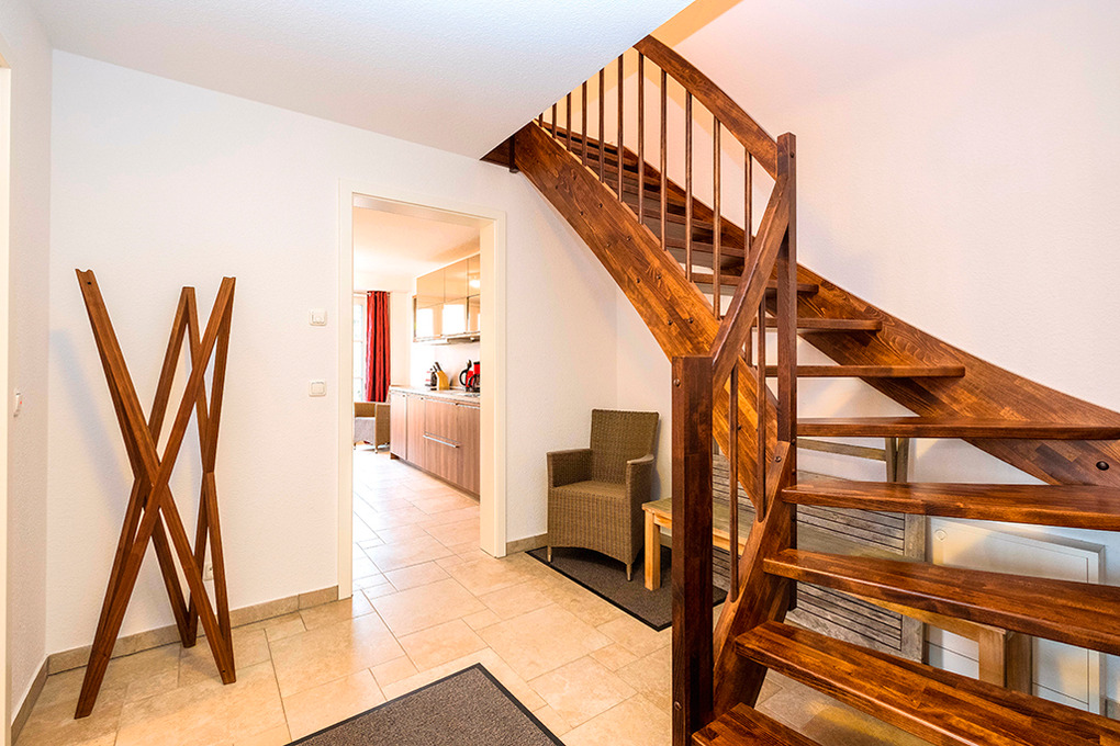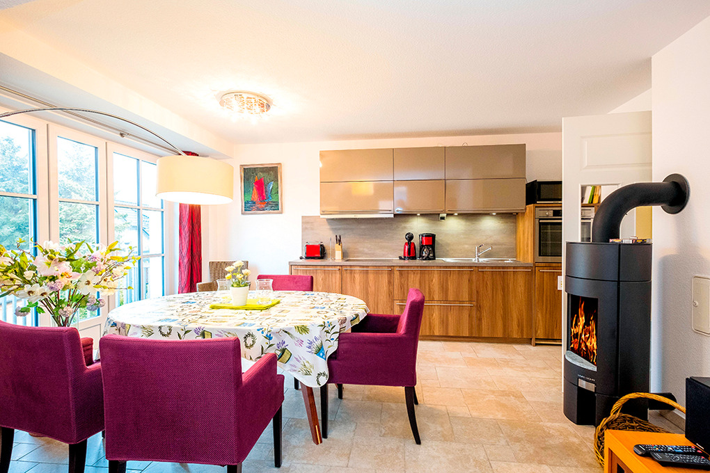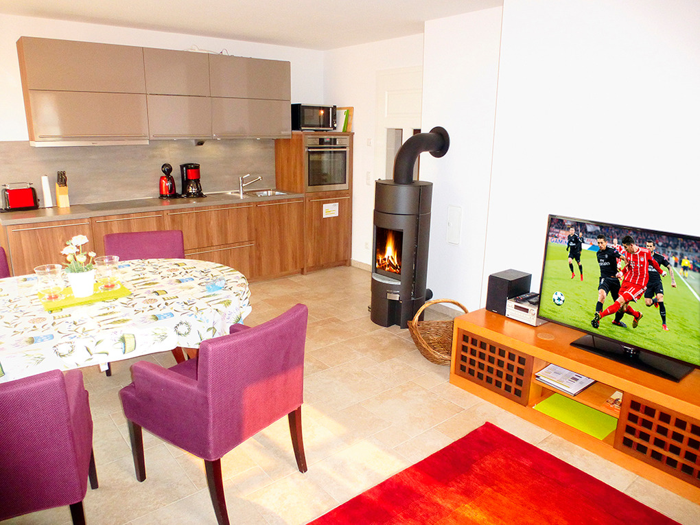 Haus: Modernes Apartmenthaus, in 2014 neu erbaut. Komfortable Ferienwohnung mit Kaminofen, geschmackvoller, hochwertiger Möblierung. Kostenloser Internetzugang über W-Lan. Zentralheizung. Nichtraucherwohnung. Balkon mit Sitzmöbeln. 1 Pkw-Stellplatz, 1 Fahrradschuppen pro Fewo.