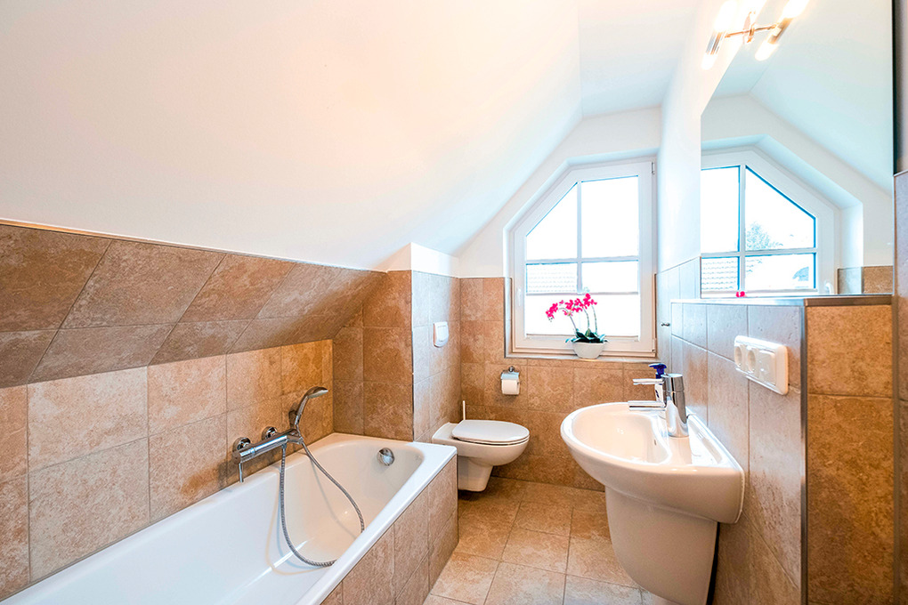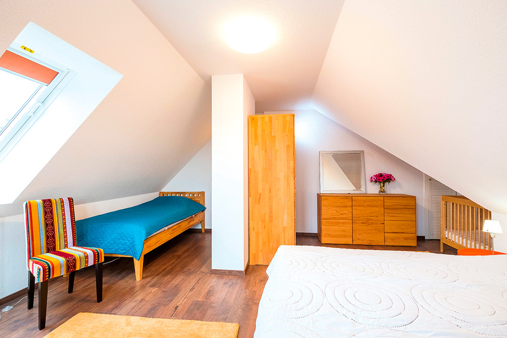 D 67.69 Wohnung 1-5 Pers.: 3-Zimmerwohnung mit 80 qm Wohnfläche über 2 Etagen, 1. Etage. Wohn-/Essraum mit Kaminofen, Couchgarnitur, Sat-TV, DVD, Stereoanlage, Esstisch, gut ausgestatteter Küchenzeile (Backofen, Spülmaschine, Mikrowelle). Doppelzimmer. Bad: Du, Wb, WC, Bidet, Waschmaschine. Treppe ins ausgebaute Dachgeschoß: 3-Bettzimmer mit Doppelbett, Einzelbett, Kinderbett. Bad/WC.
