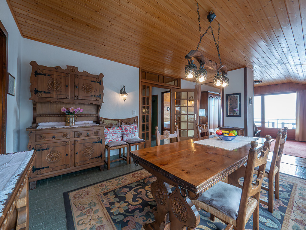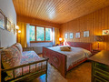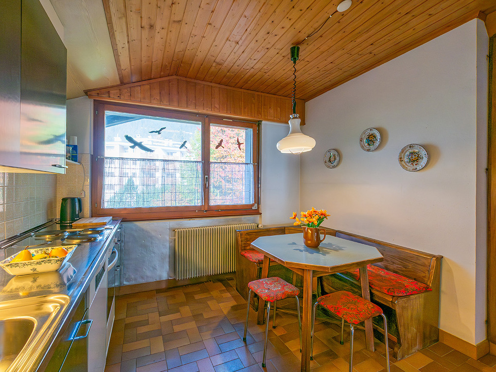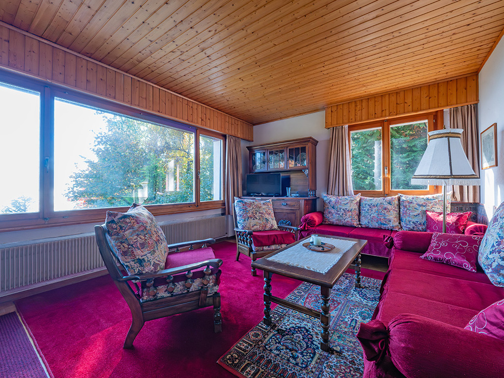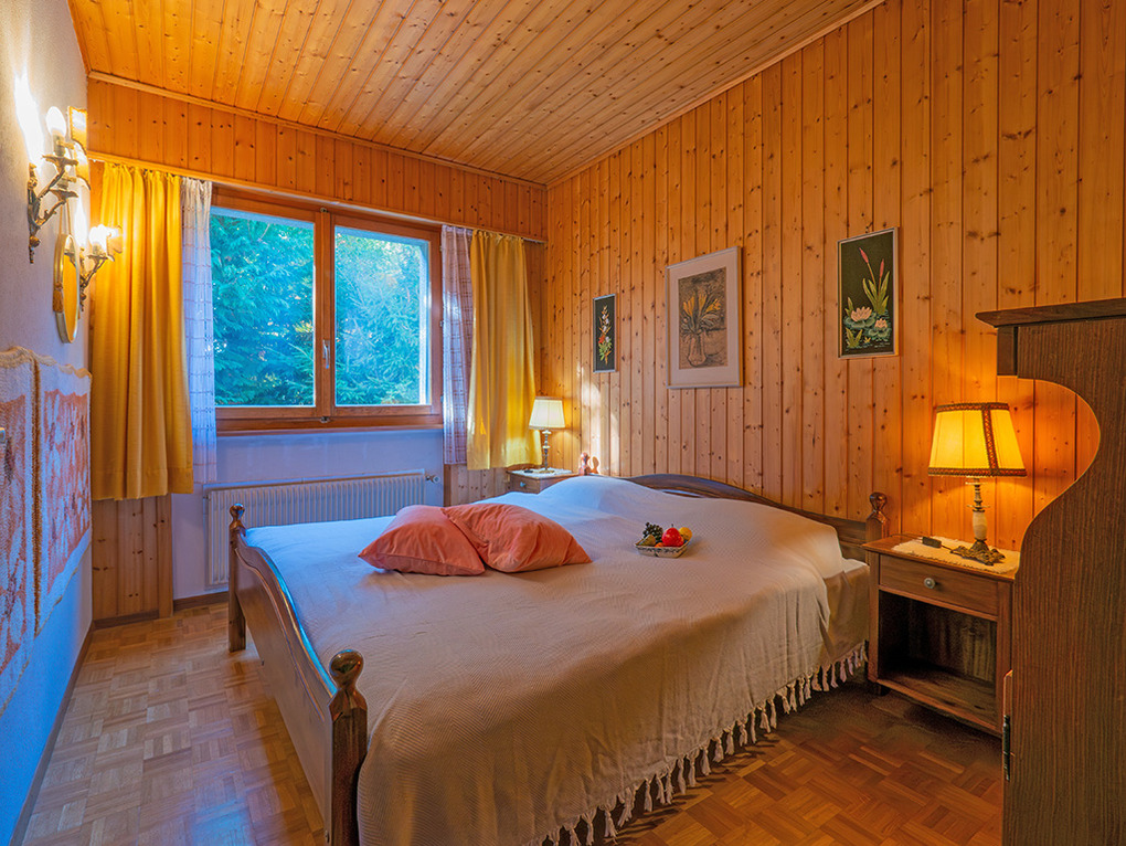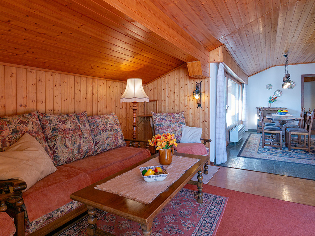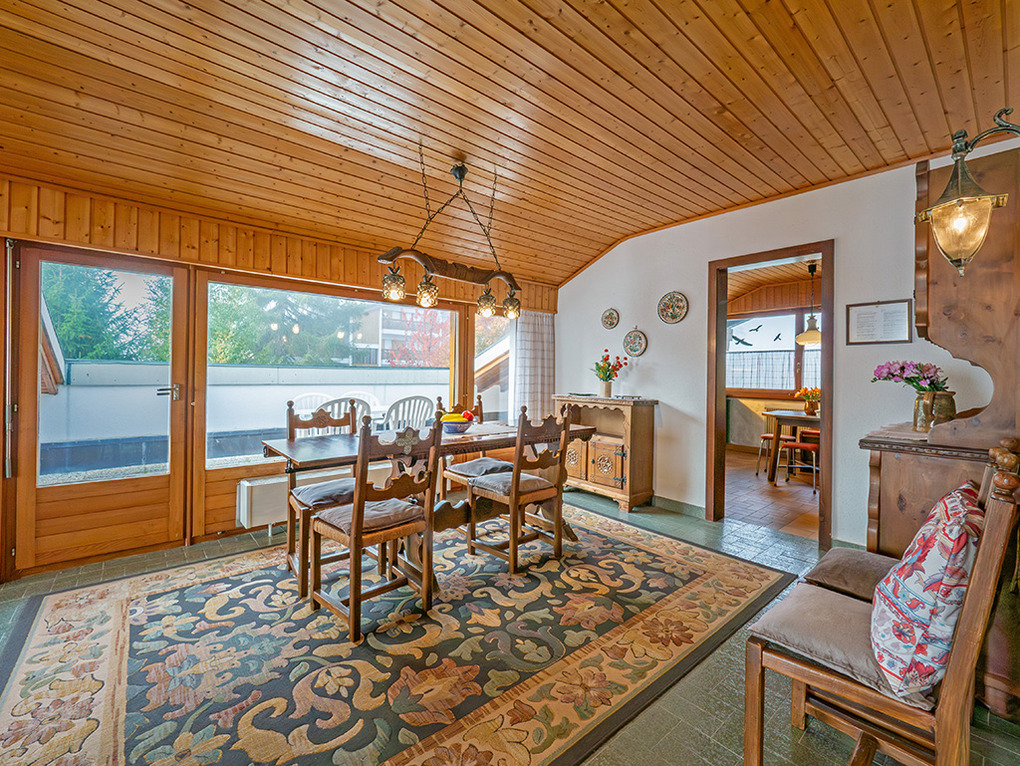 Haus: Großes regionaltypisches Chalet mit Schwimmbad und Sauna. Schönes Wohnhaus mit 2 Ferienwohnungen und der fest bewohnten Wohnung des Vermieters. Bei gemeinsamer Anmietung beider Fewos ergeben sich 6 Zimmer mit 180 qm Wohnfläche, gemeinsames Essen in der oberen Wohnung möglich. Gemütliche Chalet-Atmosphäre durch Holzvertäfelungen in vielen Räumen. Im Haus: großes Schwimmbad (10 x 4,50 Meter, 28°C, kostenfrei nutzbar) mit Ruheliegen vor großen Panoramafenstern, Sauna (Gebühr), Duschen, WC. Internetzugang über W-Lan. Waschmaschine. Zentralheizung. Nichtraucherhaus. Balkon oder Terrasse (Sitzmöbel). Tiefgarage mit 4 Pkw-Stellplätzen (max. 1,95 m Höhe), weitere Außenplätze je nach Verfügbarkeit. Hinweise: Betriebszeiten Schwimmbad nur von Weihnachten bis Ostern. Gemeinschaftsnutzung mit zwei weiteren Fewos im Nachbarchalet. Aufgrund der Bettengrößen ist eine Belegung mit max. 12 Erwachsenen möglich.
