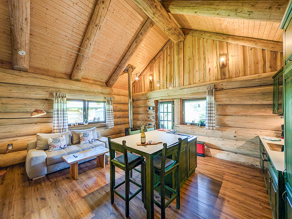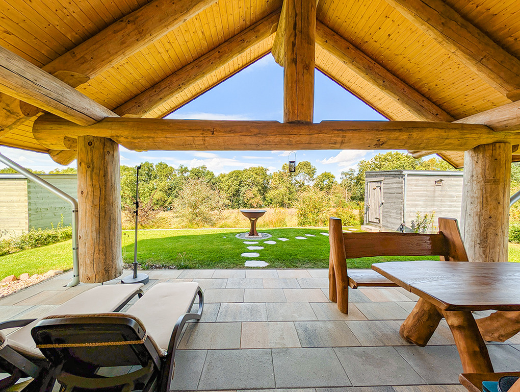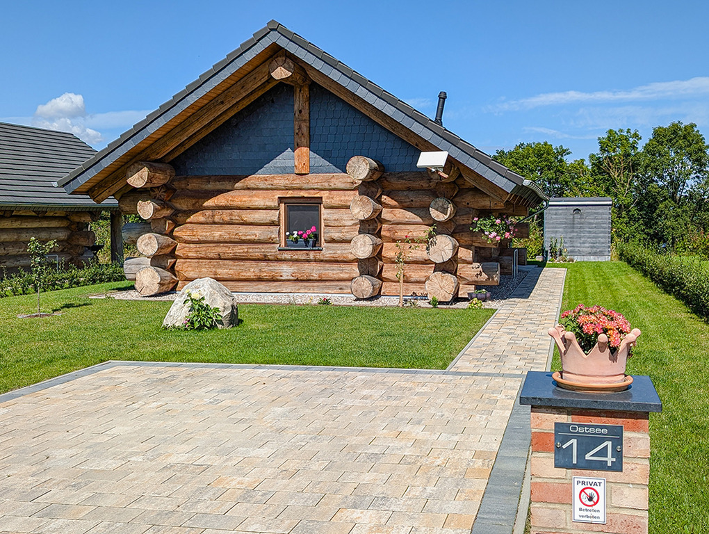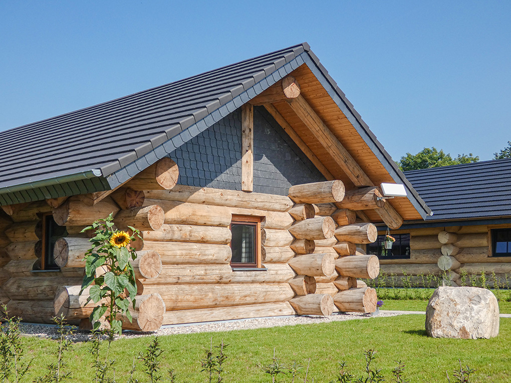 Haus: Sehr schöne Ferienhäuser mit Kaminofen und Sauna. Kleine Ferienhaussiedlung mit sieben Naturstammhäusern im kanadischen Blockhausstil. Jedes Haus mit rustikal-gemütlichem Ambiente. Geschmackvolle Einrichtung, moderne Komfortausstattung. Glasfaser-Internetzugang über W-Lan. Waschmaschine. Zentral-/Fußbodenheizung. Nichtraucherhaus. Große überdachte Terrasse mit Sitzmöbeln, Feuerschale, Cortenstahl-Grill. Garten mit Rasenfläche, Ruheliegen. Eigenes Saunahaus mit Panoramafenster. 2 Pkw-Stellplätze am Haus.