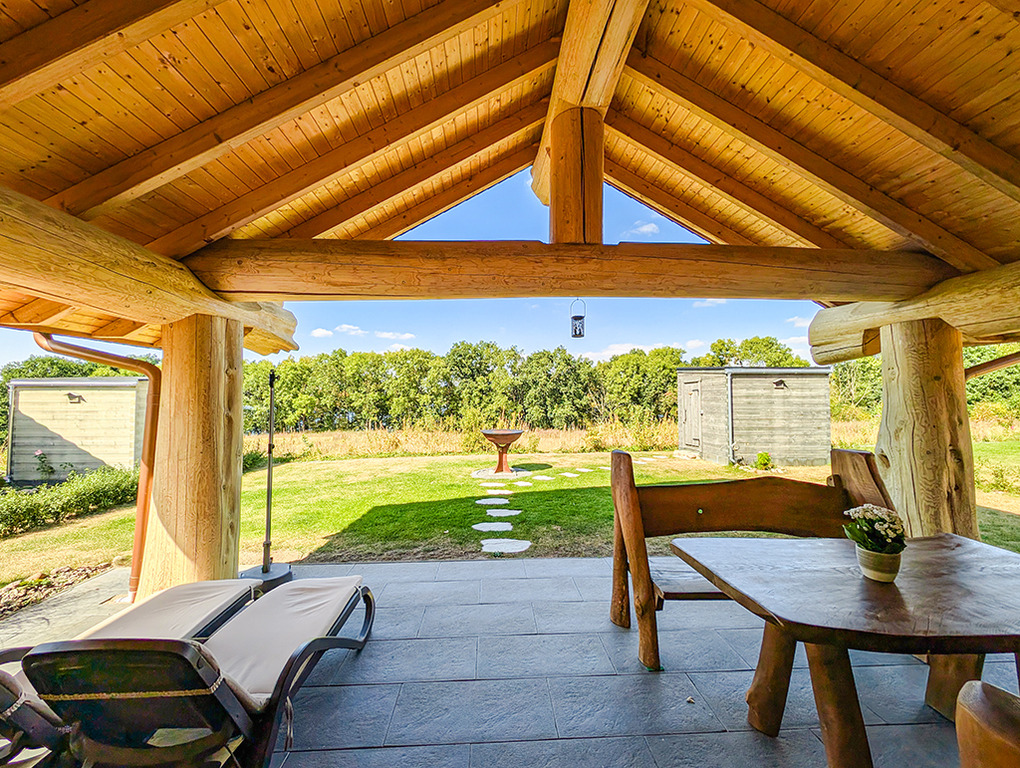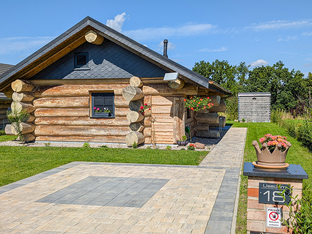 Haus: Sehr schöne Ferienhäuser mit Kaminofen und Sauna. Kleine Ferienhaussiedlung mit sieben Naturstammhäusern im kanadischen Blockhausstil. Jedes Haus mit rustikal-gemütlichem Ambiente. Geschmackvolle Einrichtung, moderne Komfortausstattung. Glasfaser-Internetzugang über W-Lan. Waschmaschine. Zentral-/Fußbodenheizung. Nichtraucherhaus. Große überdachte Terrasse mit Sitzmöbeln, Feuerschale, Cortenstahl-Grill. Garten mit Rasenfläche, Ruheliegen. Eigenes Saunahaus mit Panoramafenster. 2 Pkw-Stellplätze am Haus.