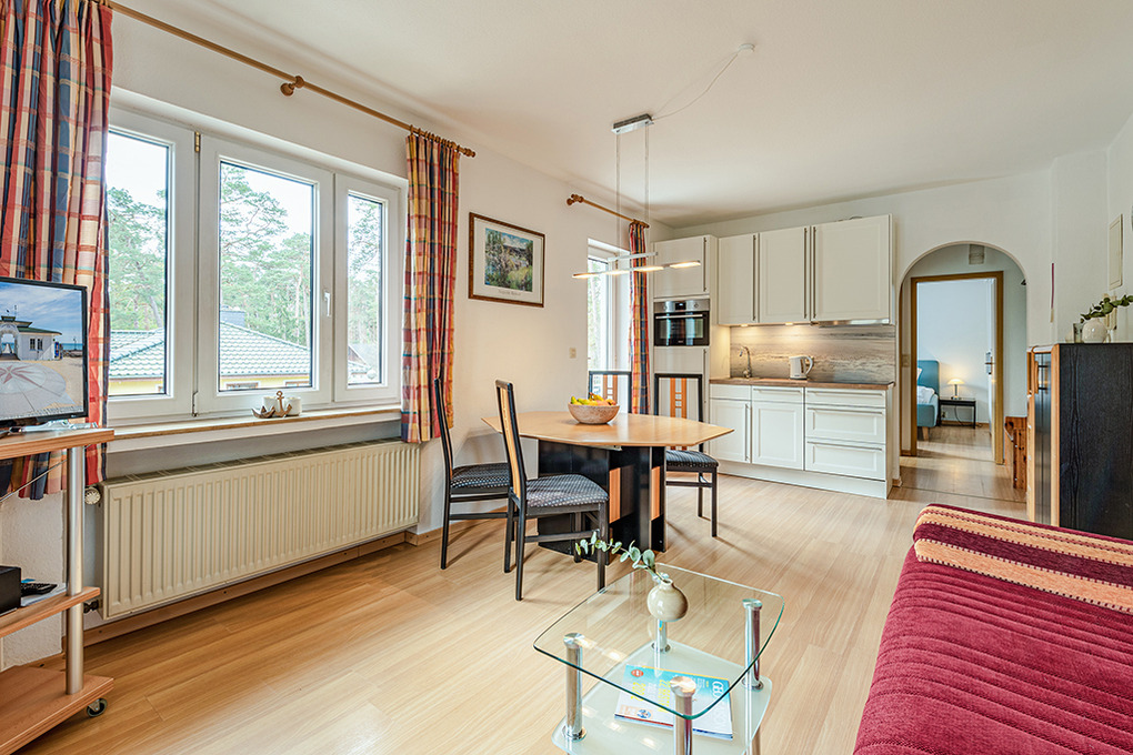D 92.5 Wohnung 2-4 Pers.: Schöne 2-Zimmerwohnung mit 40 qm Wohnfläche. Wohnraum mit Sofa (Ausziehcouch 2 Pers.), Sat-TV, Esstisch, moderner Küchenzeile (Backofen, Spülmaschine). Doppelzimmer. Bad/ WC. Balkon mit Sitzmöbeln.