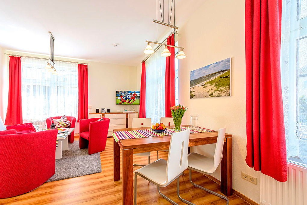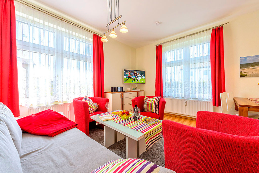 D 98.11 Wohnung 2-5 Pers.: Schöne 2-Zimmerwohnung mit 60 qm Wohnfläche, Parterre (Nichtraucherwohnung). Wohn-/Essraum mit Couchgarnitur (Schlafcouch 2 Pers.), Sat-TV, CD-Radio, Esstisch, Küchenzeile (Backofen, Spülmaschine). 3-Bettzimmer mit Doppelbett, Schlafcouch (1 Pers.). Bad/WC mit Waschmaschine, Trockner.