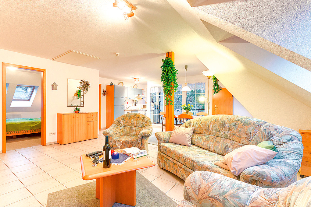 D 66.22W Wohnung 1-4 Pers.: 2-Zimmerwohnung mit 55 qm Wohnfläche, 2. Etage. Heller, freundlicher Wohn-/Essraum mit Couchgarnitur (Ausziehcouch 2 Pers.), Sat-TV, Radio, Esstisch, gut ausgestatteter Küchenzeile (Backofen, Mikrowelle, Spülmaschine). Doppelzimmer. Bad/WC.