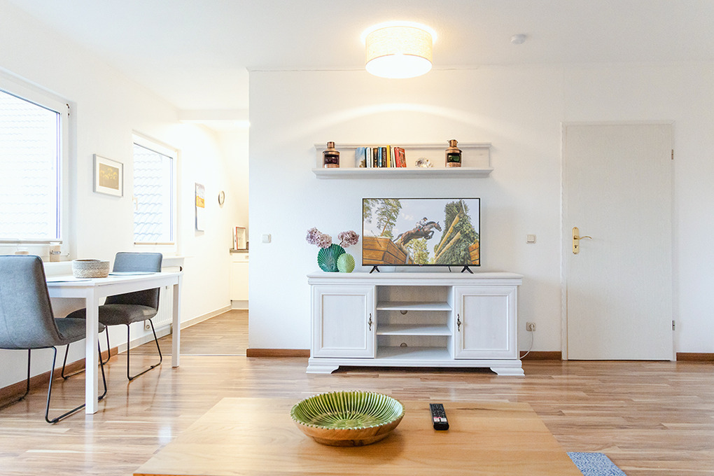Haus: Schönes, gepflegtes Apartmenthaus. Ferienwohnung mit geschmackvoller, komfortabler Einrichtung. Zentralheizung. Nichtraucherwohnung. Balkon mit Sitzmöbeln. Alle Fenster und die Balkontür sind mit Insektenschutzgittern ausgestattt. Fahrradschuppen. 1 Pkw-Stellplatz pro Fewo.