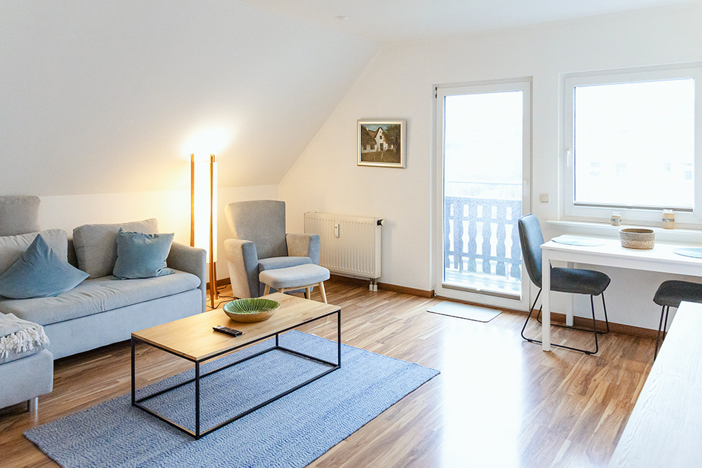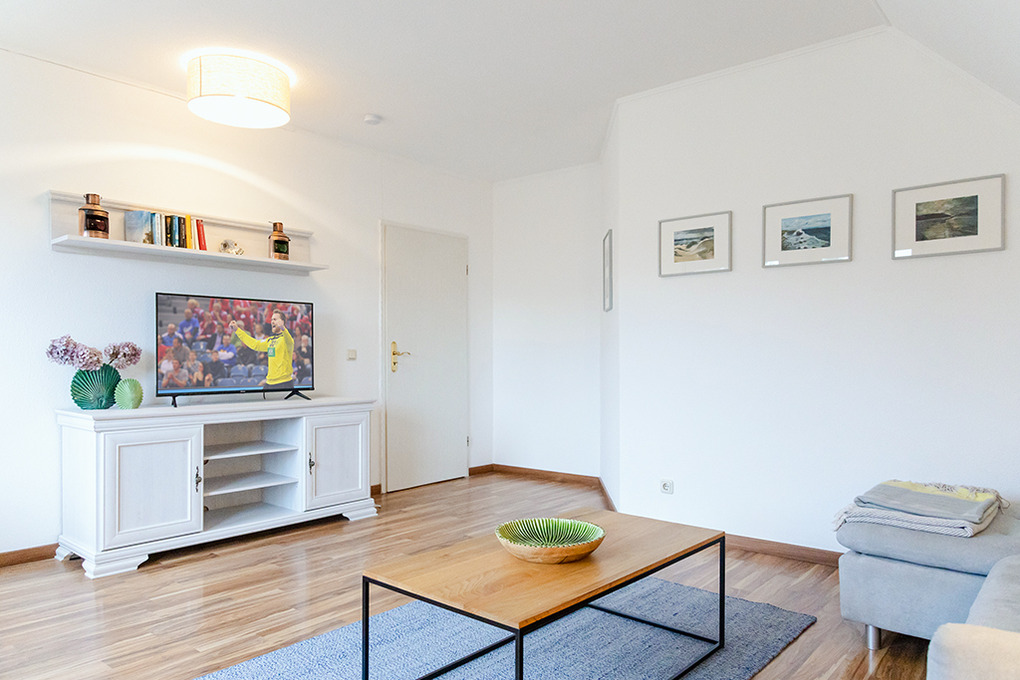 D 12.14 Wohnung 2 Pers.: Sehr schöne und moderne 2-Zimmerwohnung mit 52 qm Wohnfläche, 1. Etage. Wohn-/Essraum mit Couchgarnitur, Sat-TV, Radio/CD, Esstisch, Einbauküche (4-E-Platten Ceranfeld, Backofen, Mikrowelle, Spülmaschine). Doppelzimmer. Bad/WC. Balkon mit Sitzmöbeln.