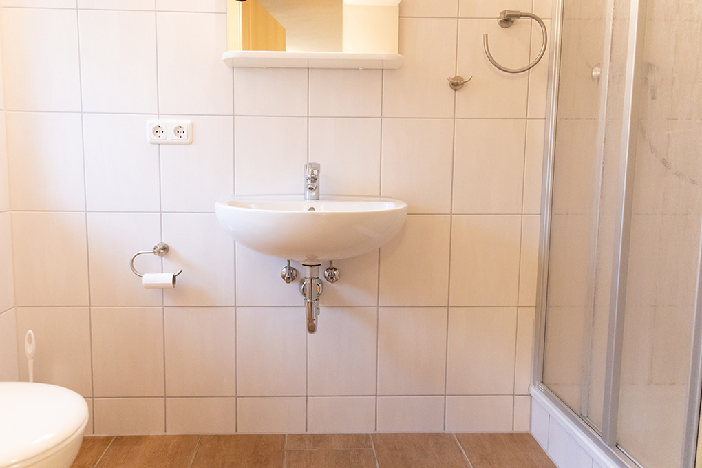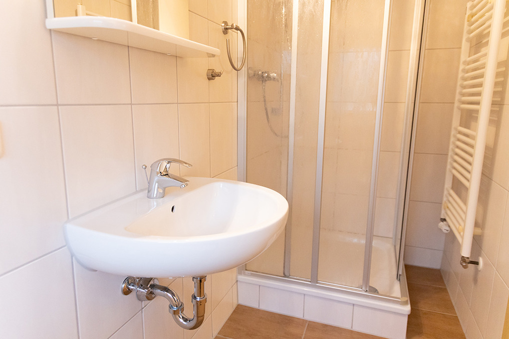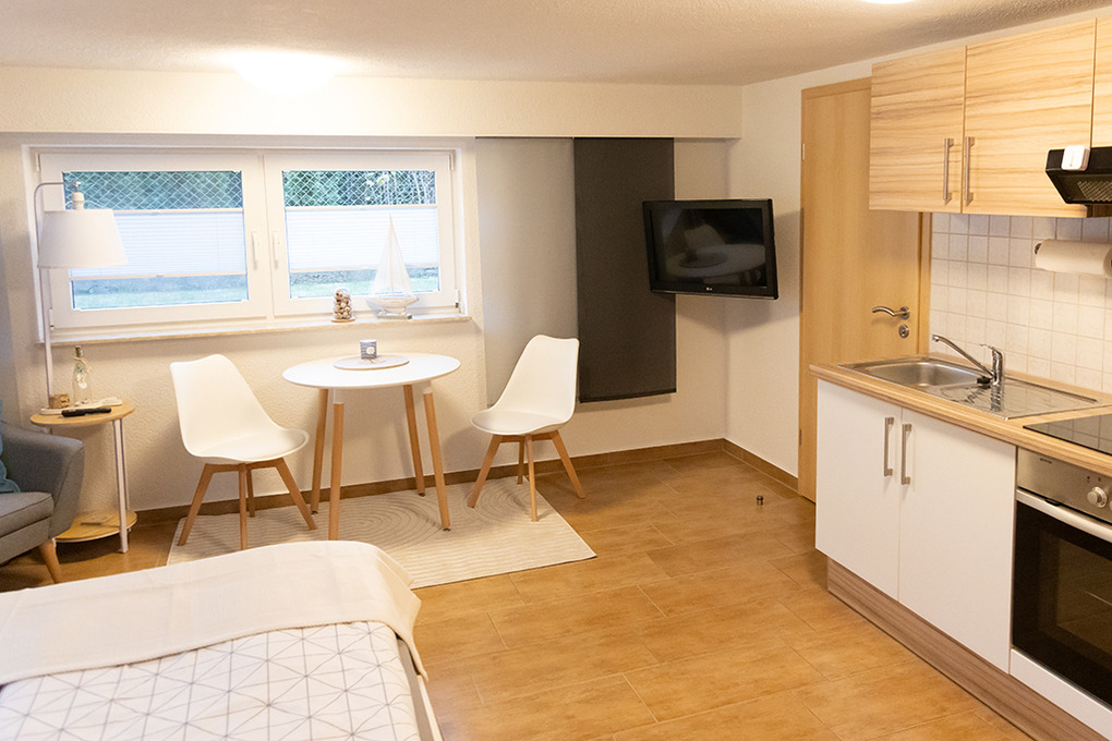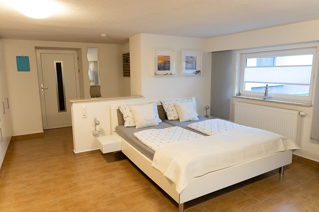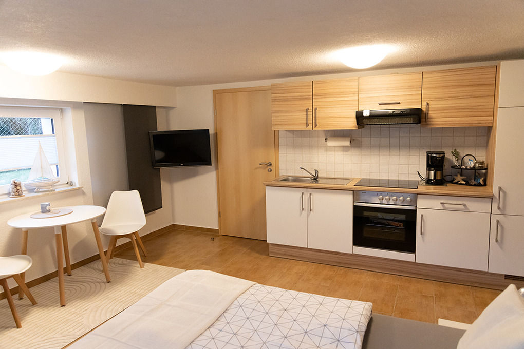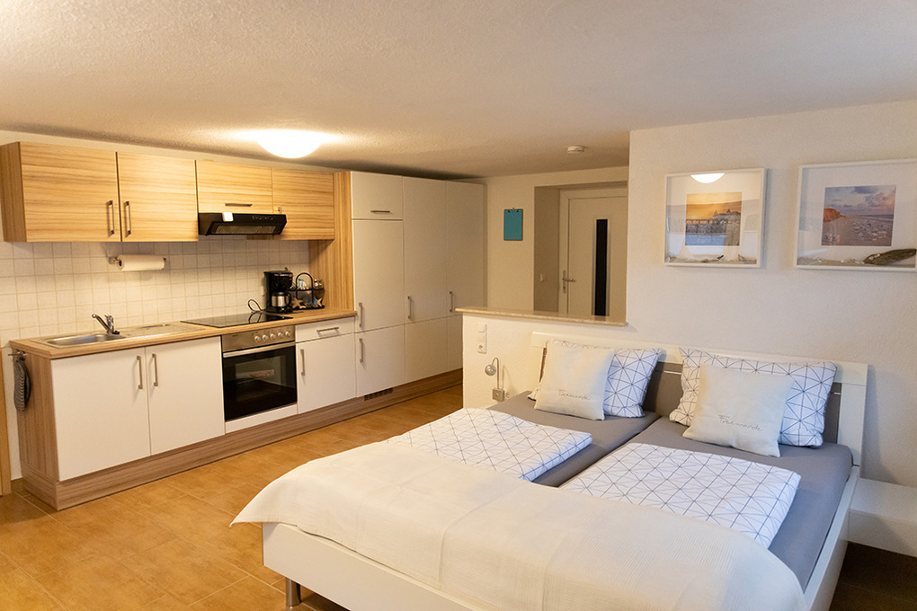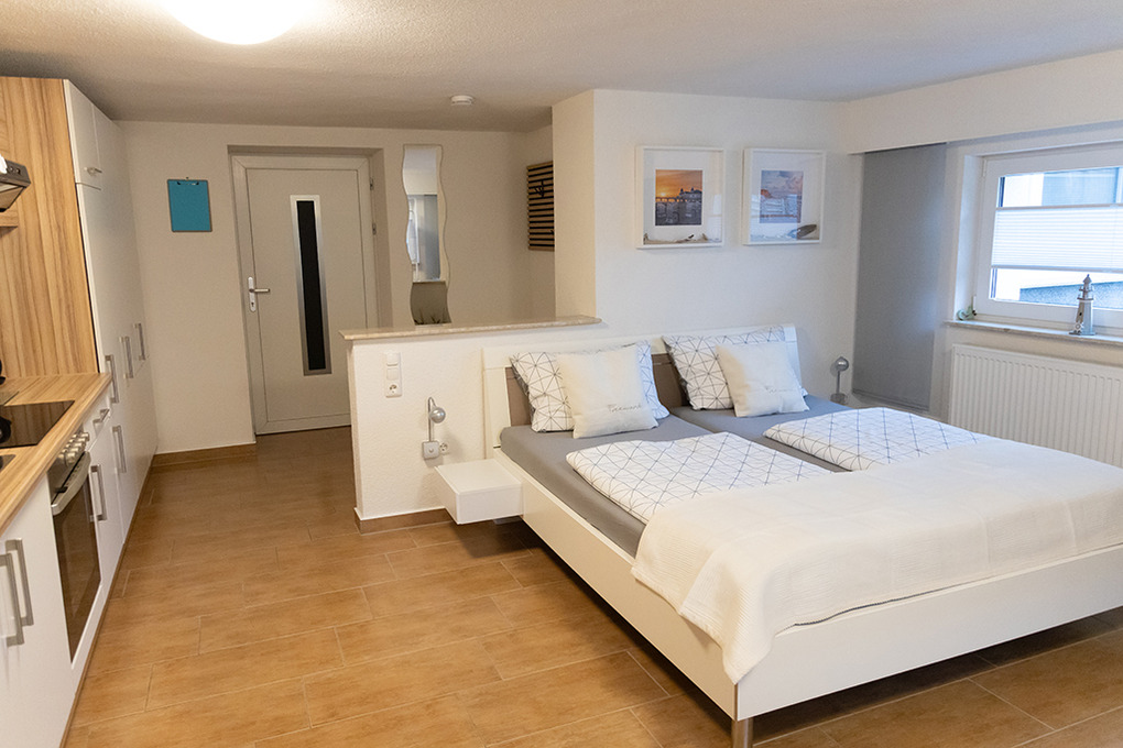 D 20.44 Wohnung 1-2 Pers.: Ein romantischer Rückzugsort für Paare! Das Studio überzeugt mit einer warmen, modernen Einrichtung, einem Bad mit Dusche und einer bestens ausgestatteten Küche. (30 qm Wohnfläche. Souterrain. Gemütlicher Wohn-/Schlafraum mit Doppelbett (180x200), Esstisch, Einbauküche (Ceranfeld, Backofen). Bad mit Dusche, WC. Auch Fahrräder und E-Bikes mit Lademöglichkeit sind bestens untergebracht.